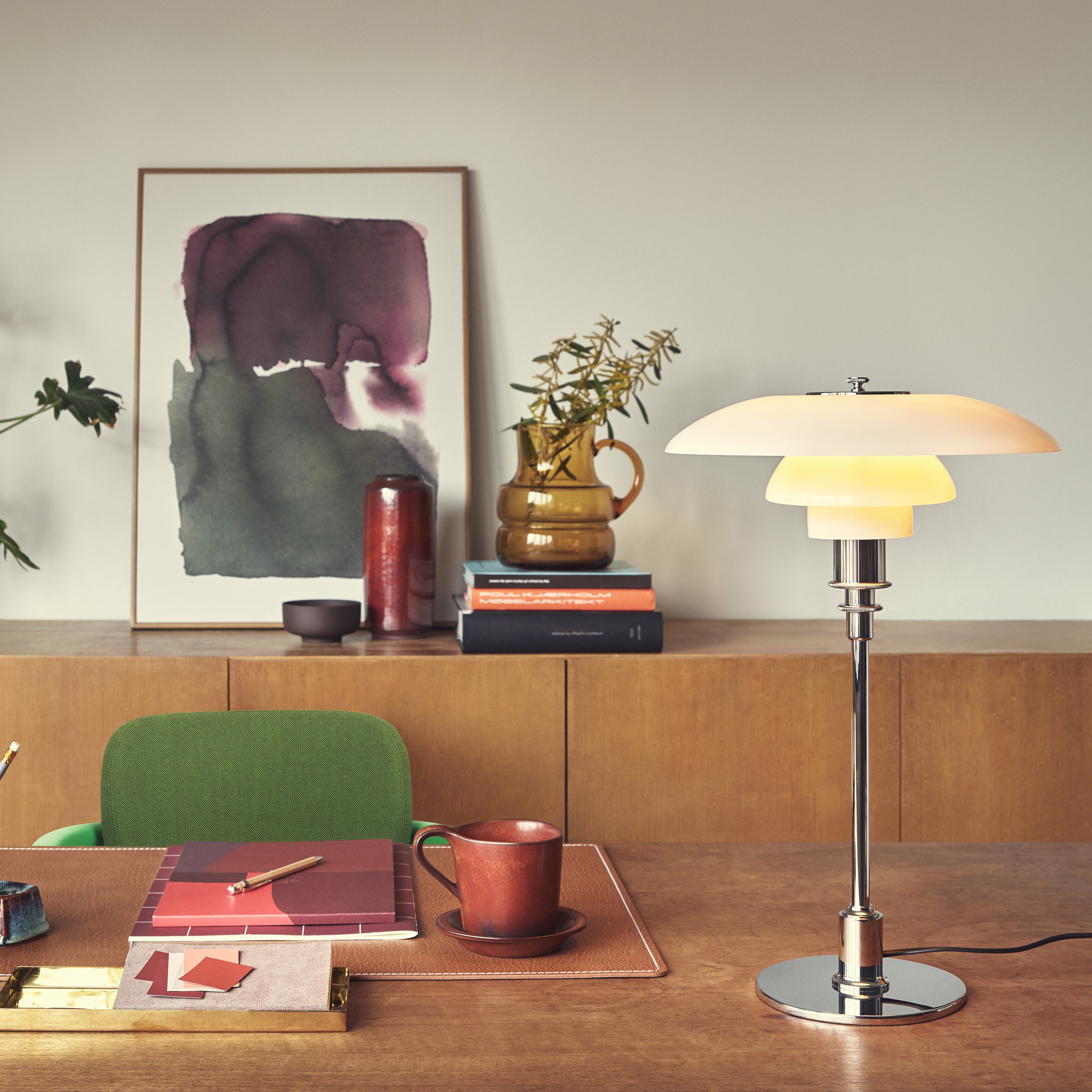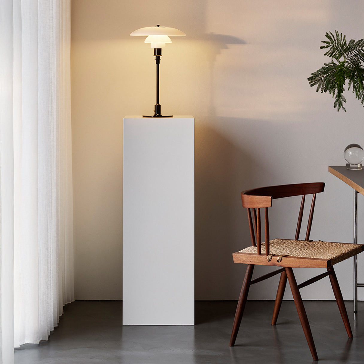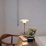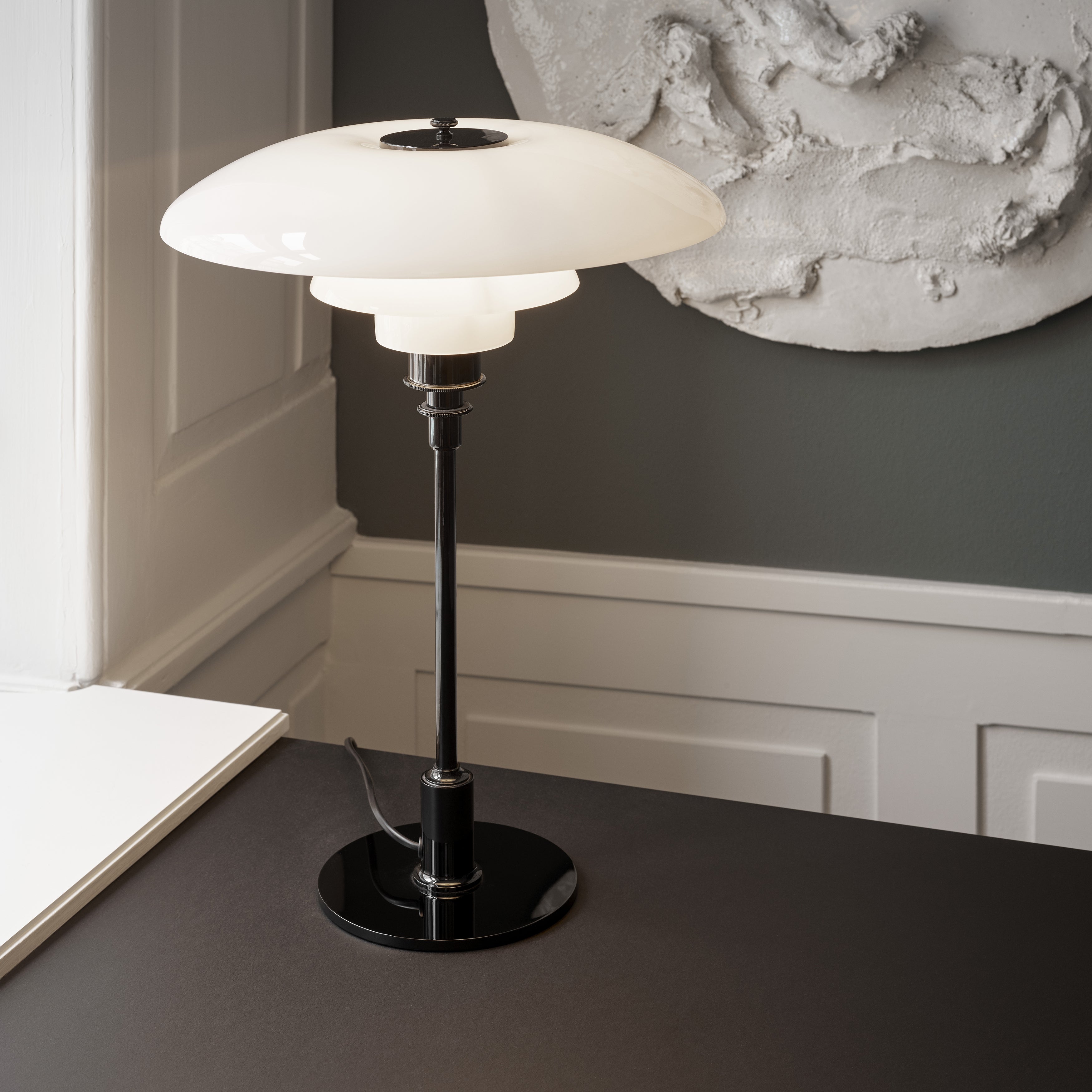 The PH 3/2 Table Lamp is a refined example of Poul Henningsen’s innovative three-shade system, developed to provide glare-free, evenly distributed light. Originally conceived in the 1920s, this system uses a logarithmic spiral to ensure consistent illumination across the shades. Crafted from mouth-blown glass, it offers a soft, diffuse light.