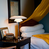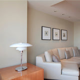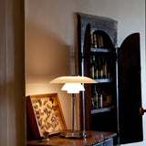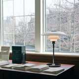 A variation on Poul Henningsen’s enduring triple-shade design, PH 4½-3½ Glass Table Lamp features a high-lustre chrome base and shades made of hand-blown opal 3-layer glass—glossy on top and sandblasted matte on the underside—giving a soft and diffused light. Based on the logarithmic spiral, light is distributed over the entire curve of the shade, which together with the reflection through the glass, makes it possible to control glare and shadow.