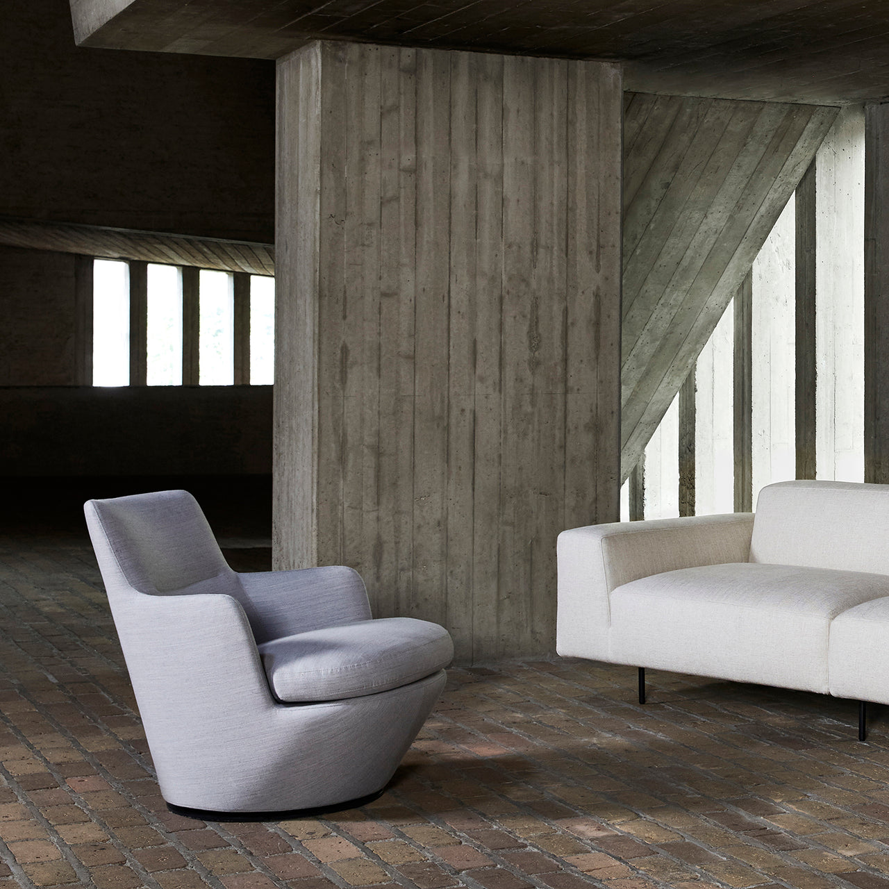 With this low-back armchair, Bensen adds another contender to the U Turn family. Lo Turn swivels smoothly for an entire 360 degrees (available with or without self-return mechanism) and its inviting arms are mated with a comfy down seat. The readily tailored look of the seating starts with an internal steel frame layered with injection-molded cold foam. Fabric covers are velcro-attached and easily removable for cleaning or switching out.