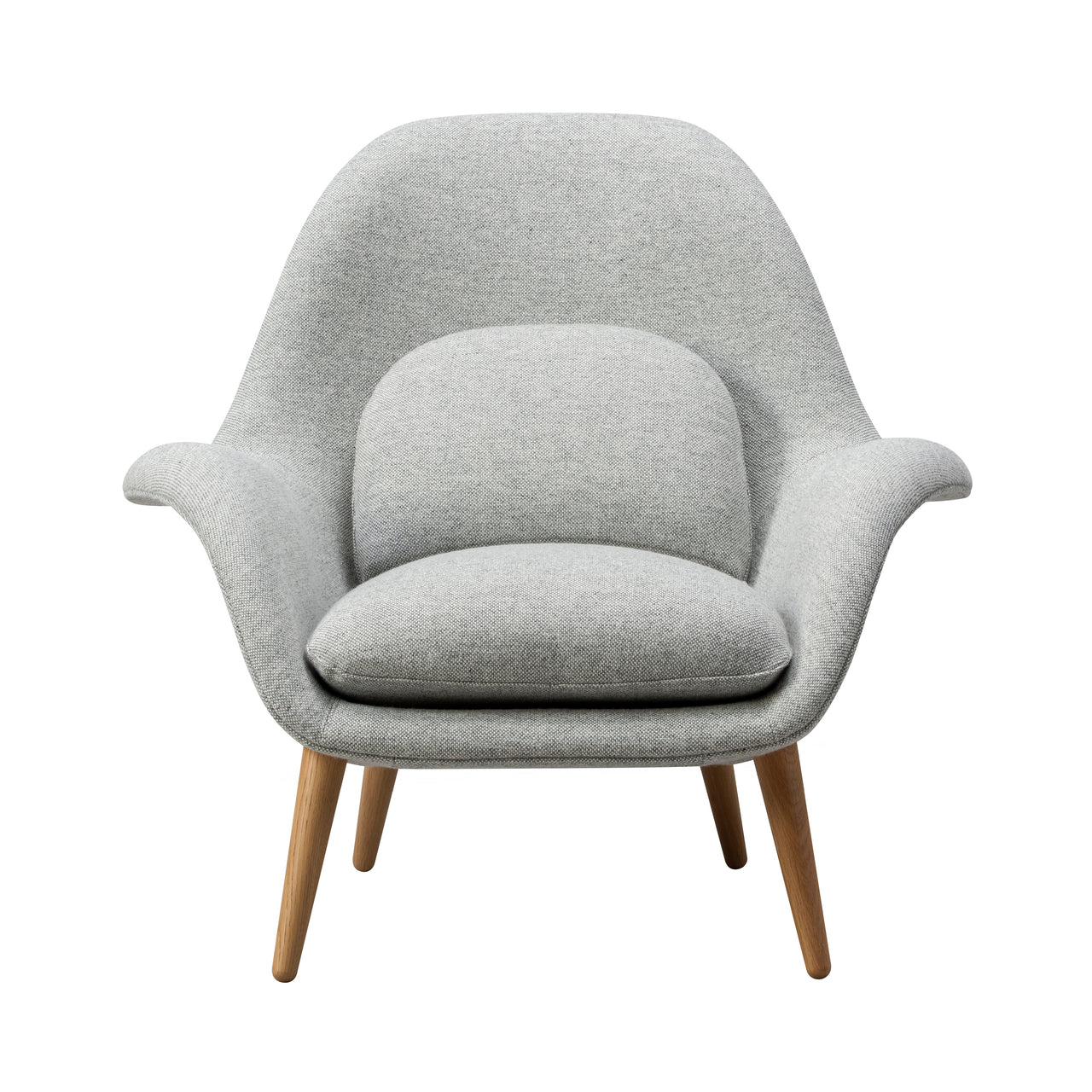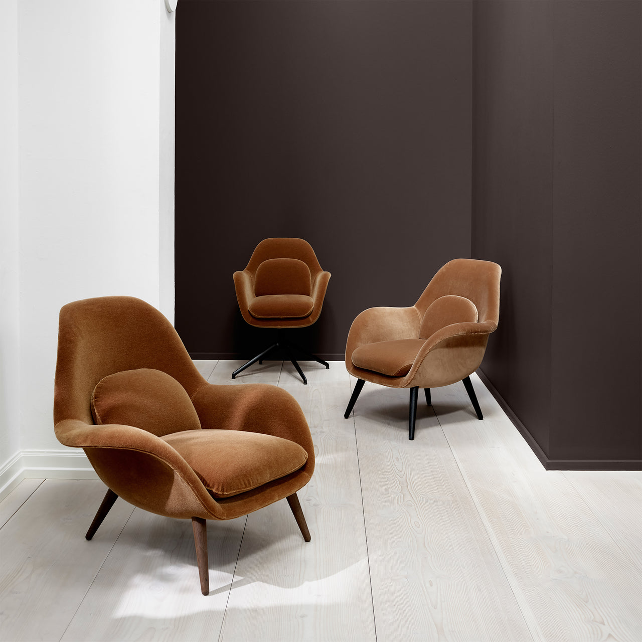 Originally working in a hotel setting but equally suited to the home, Space Copenhagen created Swoon as a hybrid with the ease of a lounge chair and the support of an armchair. The winged shell contours merge the back, seat and armrests into a single entity, allowing for exceptional comfort and accommodating varied seating postures. To the sculptural shape, add its joined seat and back cushions for further cosseting, with overall upholstery in a range of premium fabric or leather options and the complement of solid-wood legs in oak or walnut finishes.