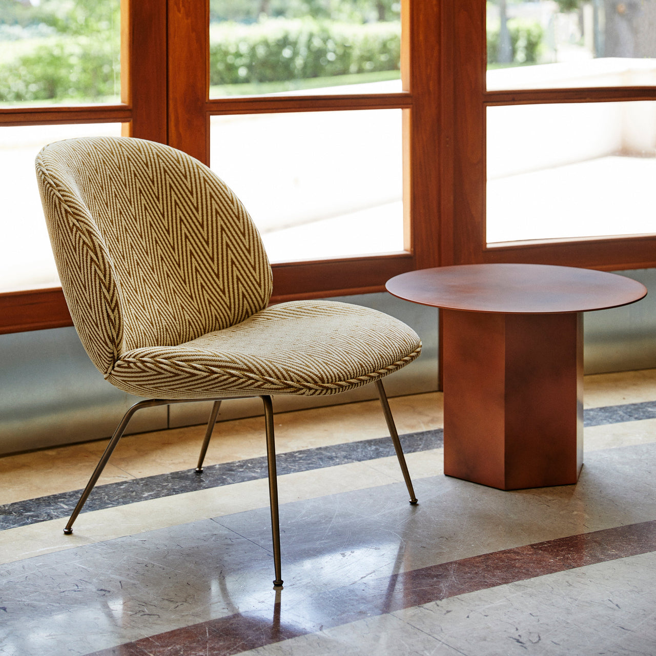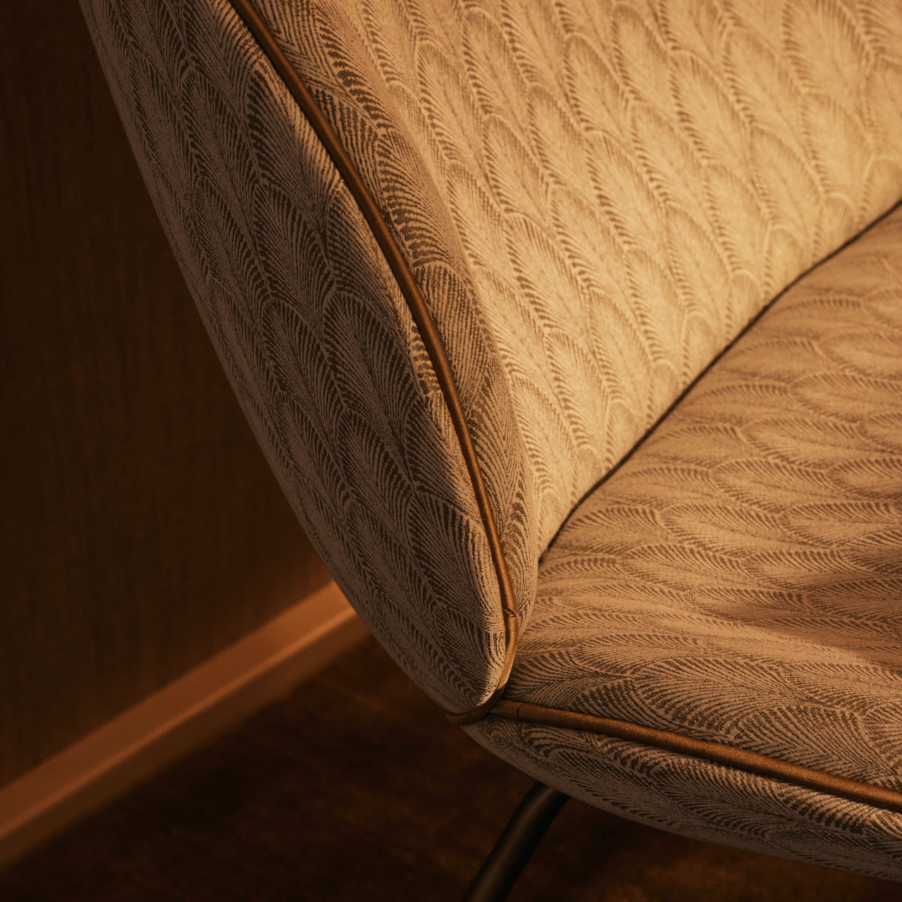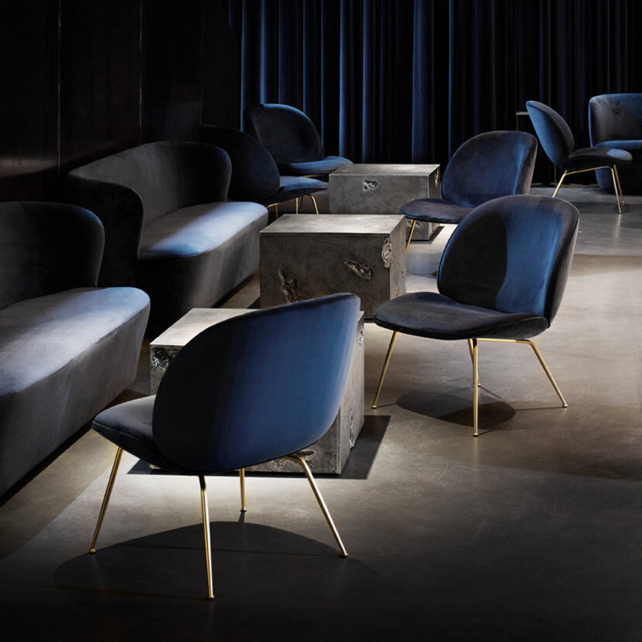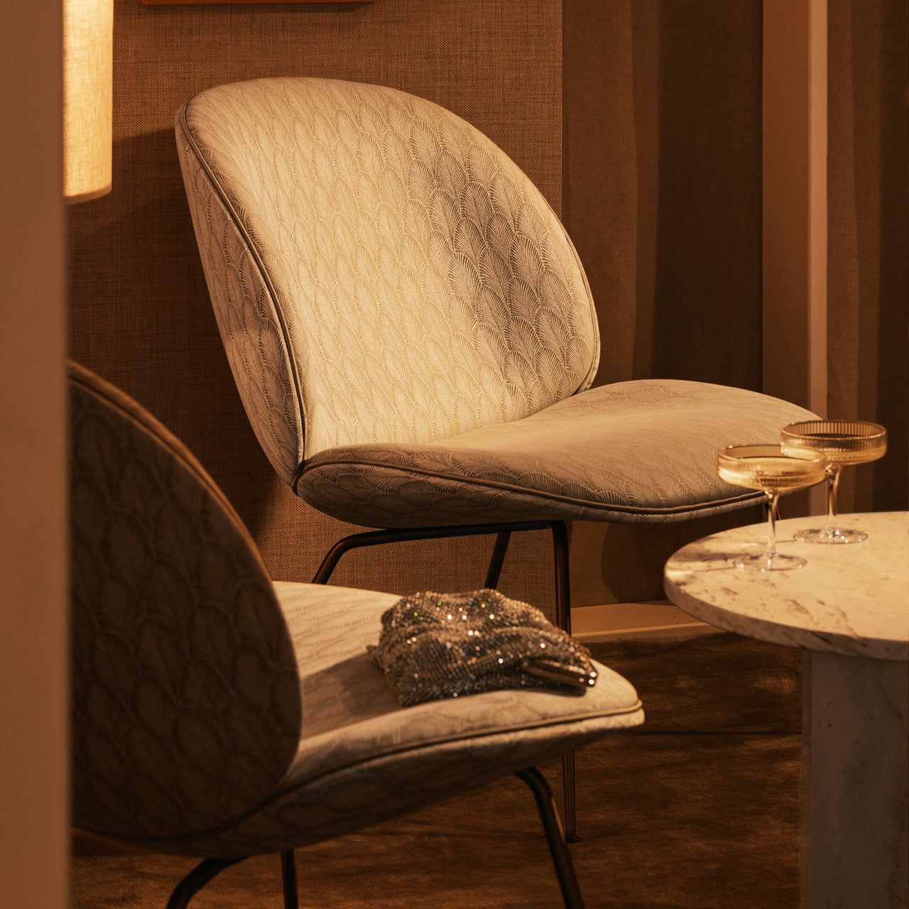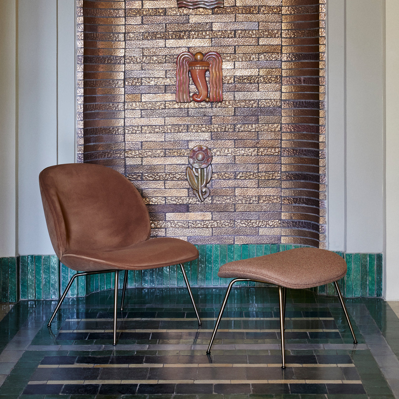 With its attenuated conic base in matte black, chrome or brass finish, the fully upholstered version of Beetle Lounge Chair combines high style and relaxed comfort. Employing gentle references, design duo GamFratesi reveals inspiration from the collection's namesake, a common garden insect. In luxurious fashion, the chair reinterprets the characteristic elements of the beetle's anatomy in the shell shape and padded interior, sheathed in a selection of fine textile and silky leather options.