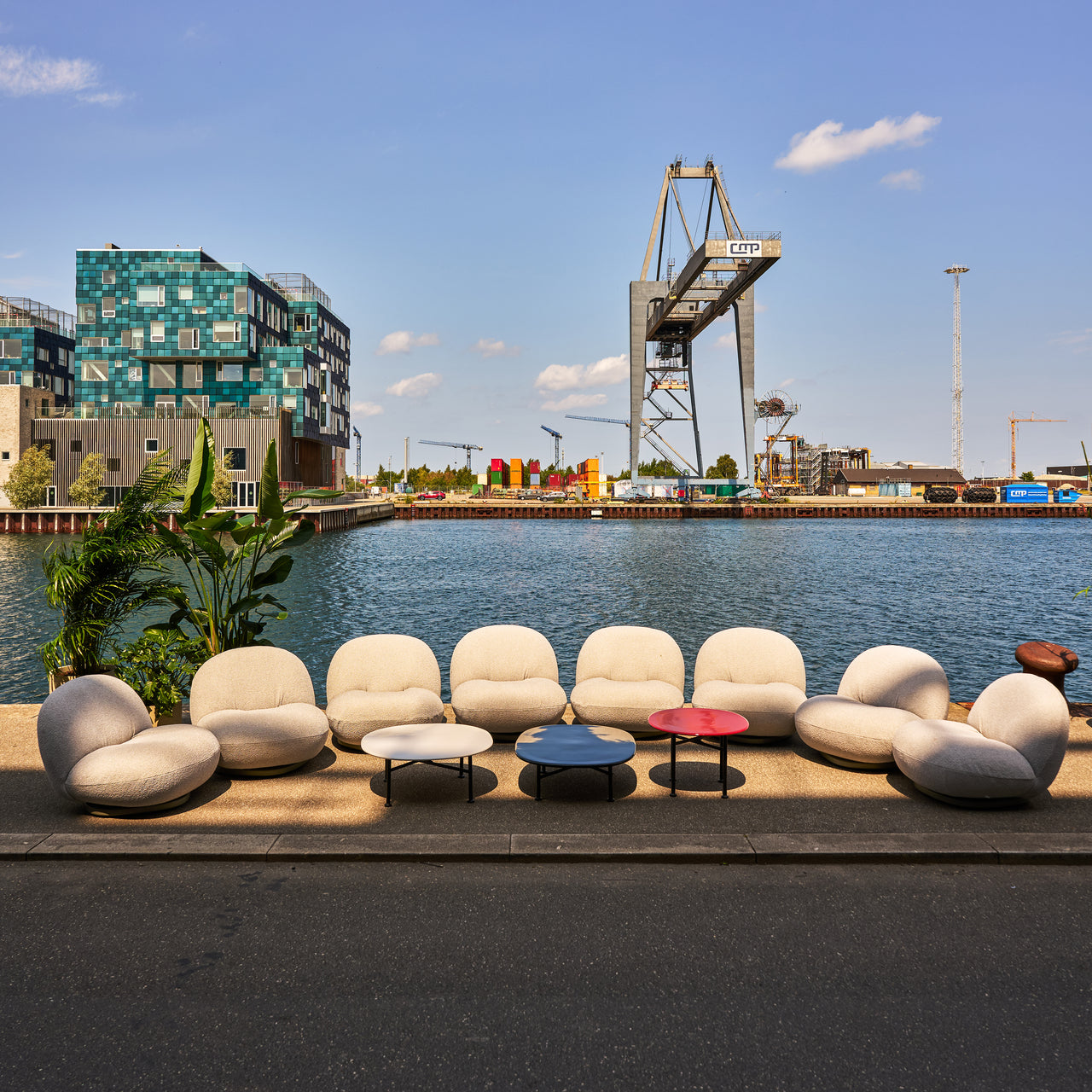 Recast by Gubi in an outdoor version, designer Pierre Paulin’s defining modernist lounge chair demonstrates its enduring appeal. Pacha’s sleek armless variant has a specially developed membrane interlayer that is both water-resistant and breathable to ensure quick drying after exposure to rain. The base is made from moisture-resistant plywood and includes a full swivel mechanism in stainless steel. Delivering plush comfort with a relatively small footprint, the versatile seating adapts easily to varied groupings in outdoor environs.