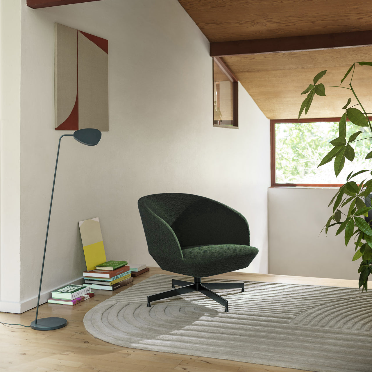 A swivel base adds a classic and dynamic feel to Muuto’s lounge chair, offering welcome flexibility and movement while seated.Oslo marries a compact design from Anderssen & Voll and expansive comfort, with the series’ signature geometric seat cushion as the foundation for a deeply embracing ease with the backrest that envelopes and supports. With its sculptural form and satisfying offer of repose, it makes a fine addition to both residential and public spaces.
