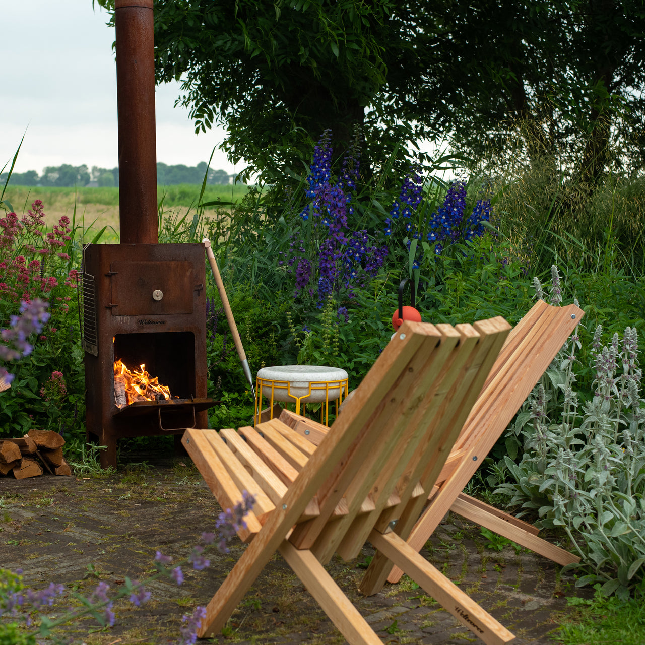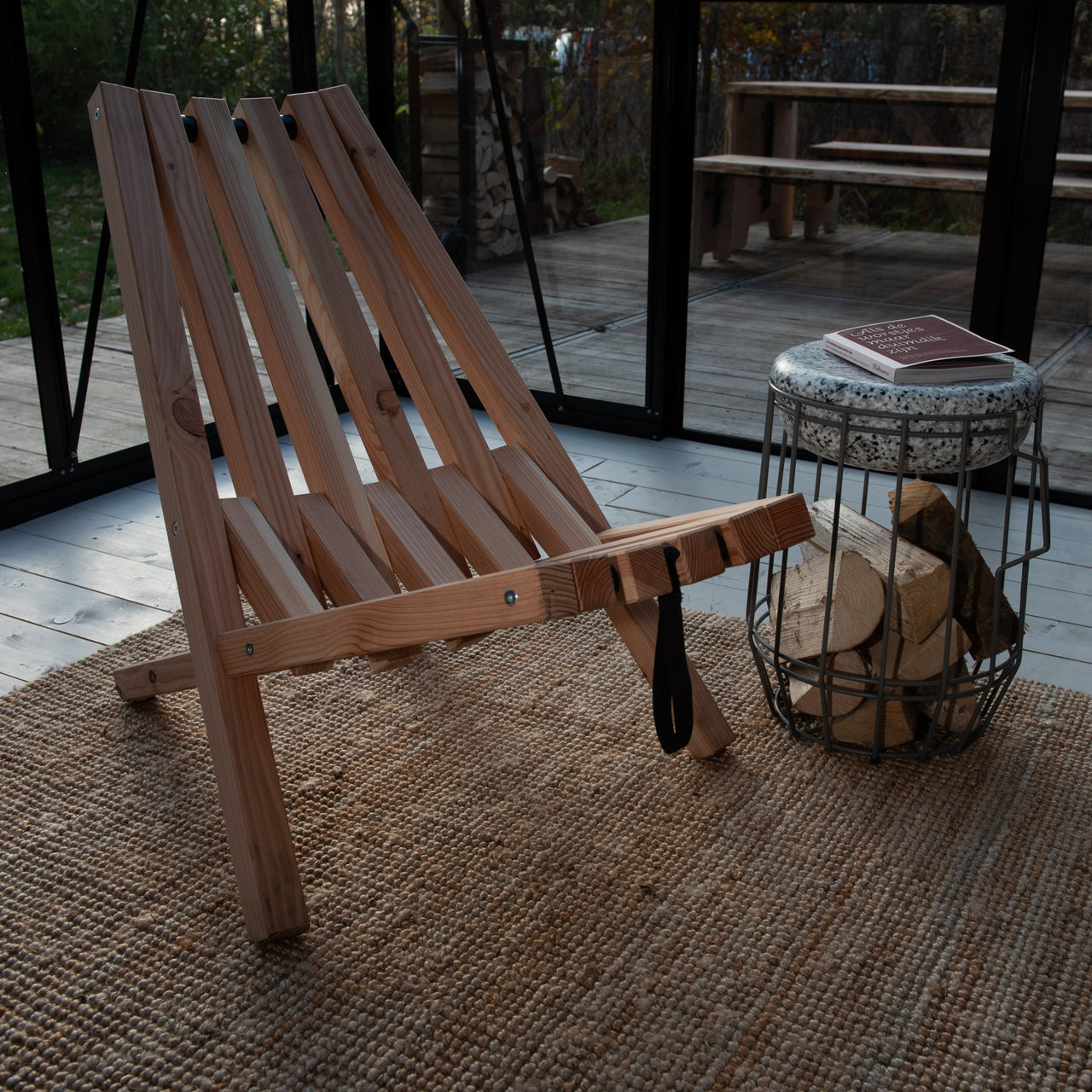 If true luxury is unfettered relaxation, Floris Schoonderbeek underscores that ease with Fieldchair. Lean back in comfort with this outdoor lounge chair crafted in honest, unfussy style. Sustainable larch wood from FSC-certified forests in the Netherlands is left untreated for a natural look and will turn a silvery grey tone over time. The chair folds flat and is easily stored when not in use, laying down or standing up. Or it can be hung from the wall by the strong carrying strap, which also makes it readily transportable for any impromptu jaunts.