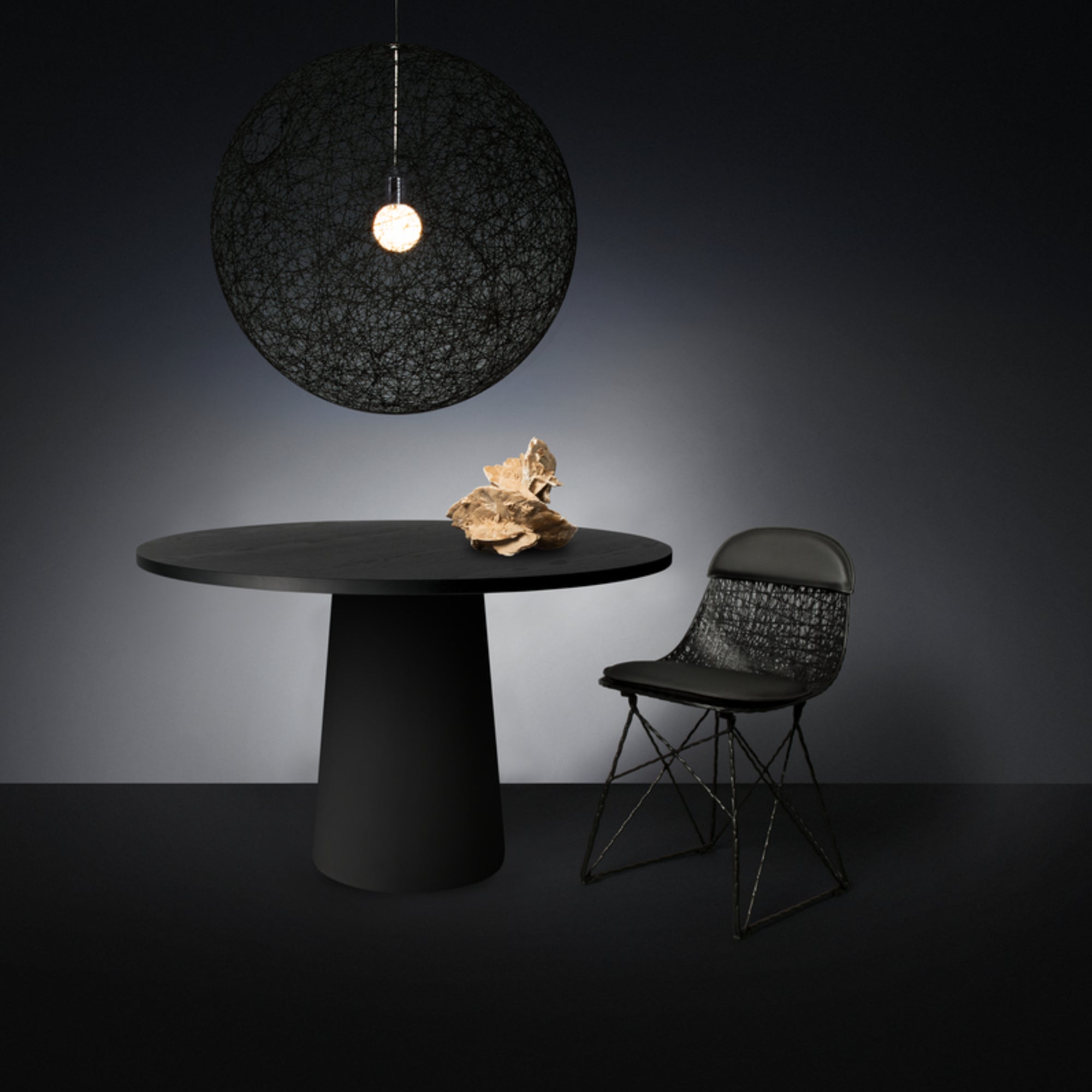 Outdoors or inside, anchor a dining area with Moooi’s round Container Classic with a range of 3 sizes that seat up to 10 persons. This lightweight design from Marcel Wanders studio has a timelessly architectural, cone-shaped PE base that is easy to move around—and then stabilized in place by filling it with sand or pebbles. In white, black or grey, tabletops are offered in HPL, a weatherproof next-gen laminate to match or in oak veneer finishes for interior use only.
