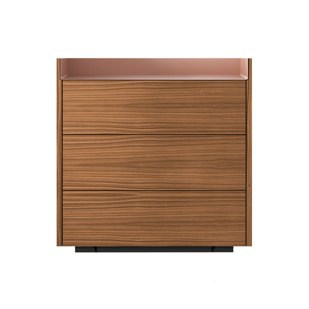 The Stockholm STH012 Chest of Drawers is a distinguished piece from the Red Dot 2015 award-winning Stockholm collection. This chest features three spacious drawers, providing ample storage for various items. The top surface is adorned with a unique anodized aluminum finish, available in bronze, gold, black, or chocolate, adding a touch of elegance to the design. Constructed from MDF E1 fiberboard and low-formaldehyde particleboard, it is veneered in natural oak or walnut, offering a choice of finishes to complement diverse interiors. The chest rests on steel legs with adjustable feet, ensuring stability on various surfaces. The Stockholm STH012 Chest of Drawers seamlessly blends functionality with sophisticated design.