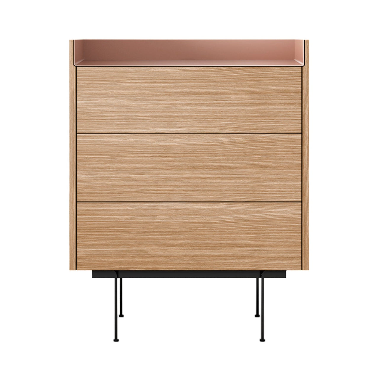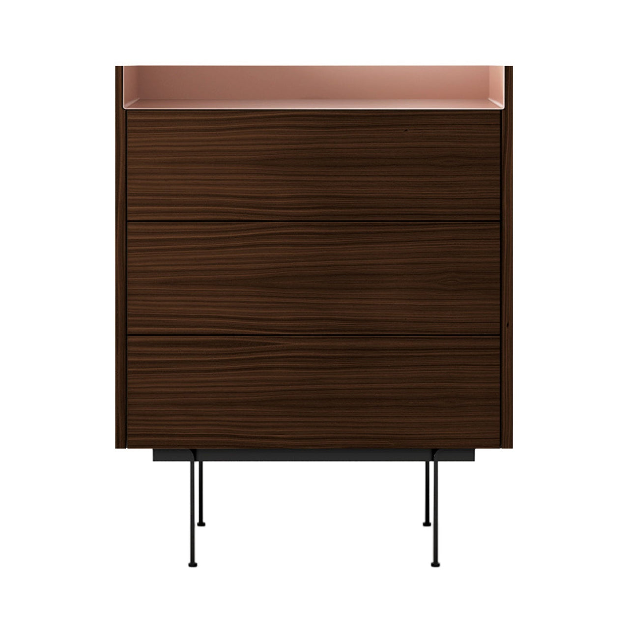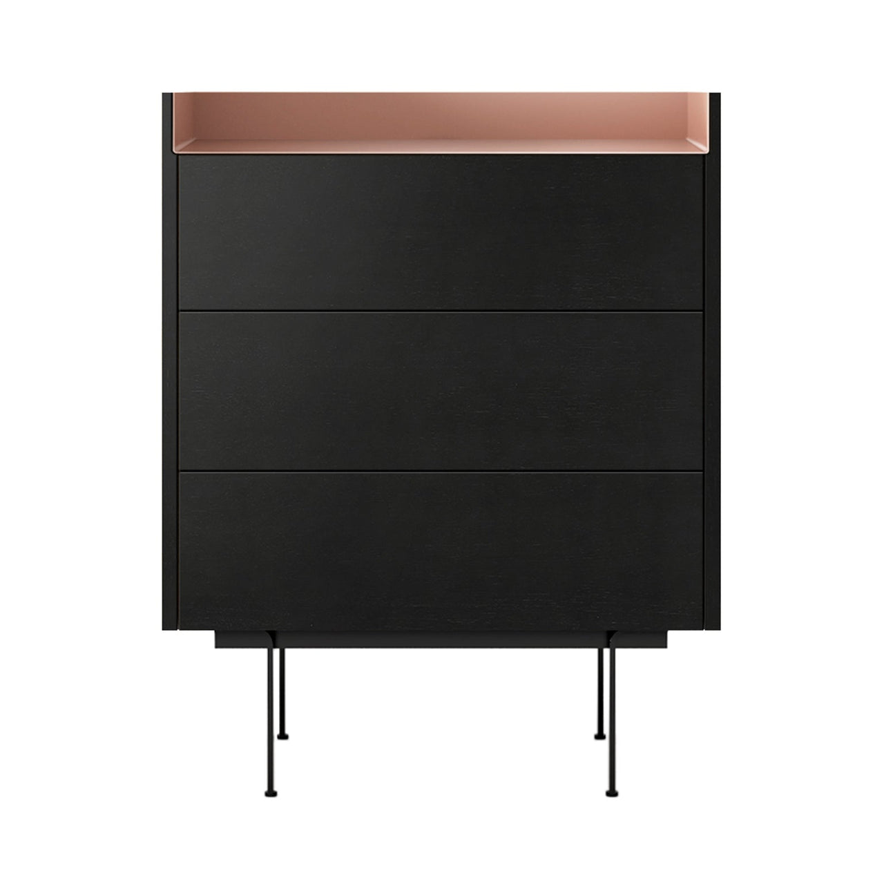 The STH012 Chest of Drawers offers ample storage with its three spacious drawers. Its top surface features an anodized aluminum finish in bronze, gold, black, or chocolate, adding a refined touch. Constructed from MDF E1 fiberboard and low-formaldehyde particleboard, the chest is veneered in natural oak or walnut to suit various interiors. It stands on steel legs with adjustable feet for stability on different surfaces. The STH012 Chest of Drawers combines practical storage with a refined design.