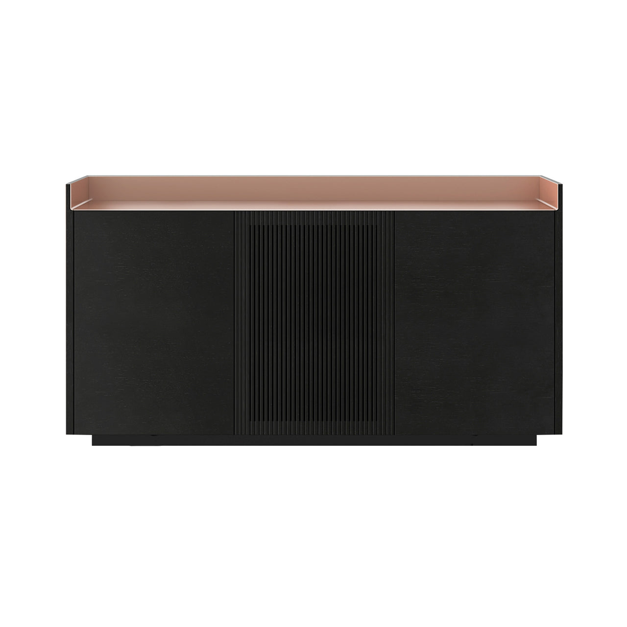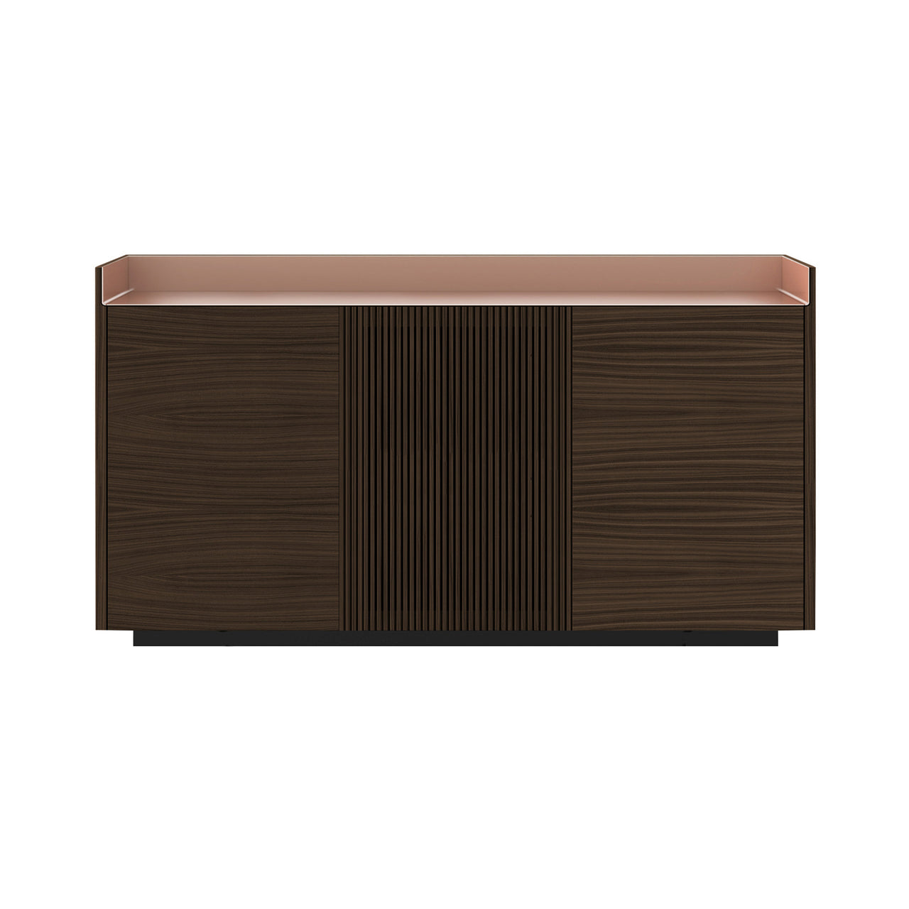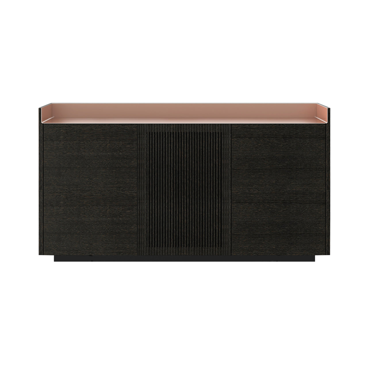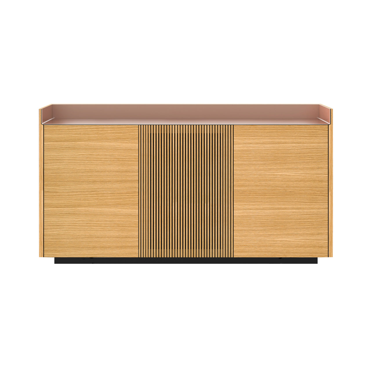 The Stockholm STH334 Cupboard features an anodized aluminum top, adding a unique touch to its design. The structure is crafted from high-quality MDF fiberboard, available in natural oak or walnut veneers. The cupboard includes doors that open to 105 degrees with concealed hinges, providing easy access to the interior, which houses an adjustable shelf for flexible storage solutions. The base is supported by a plinth in black or bronze.