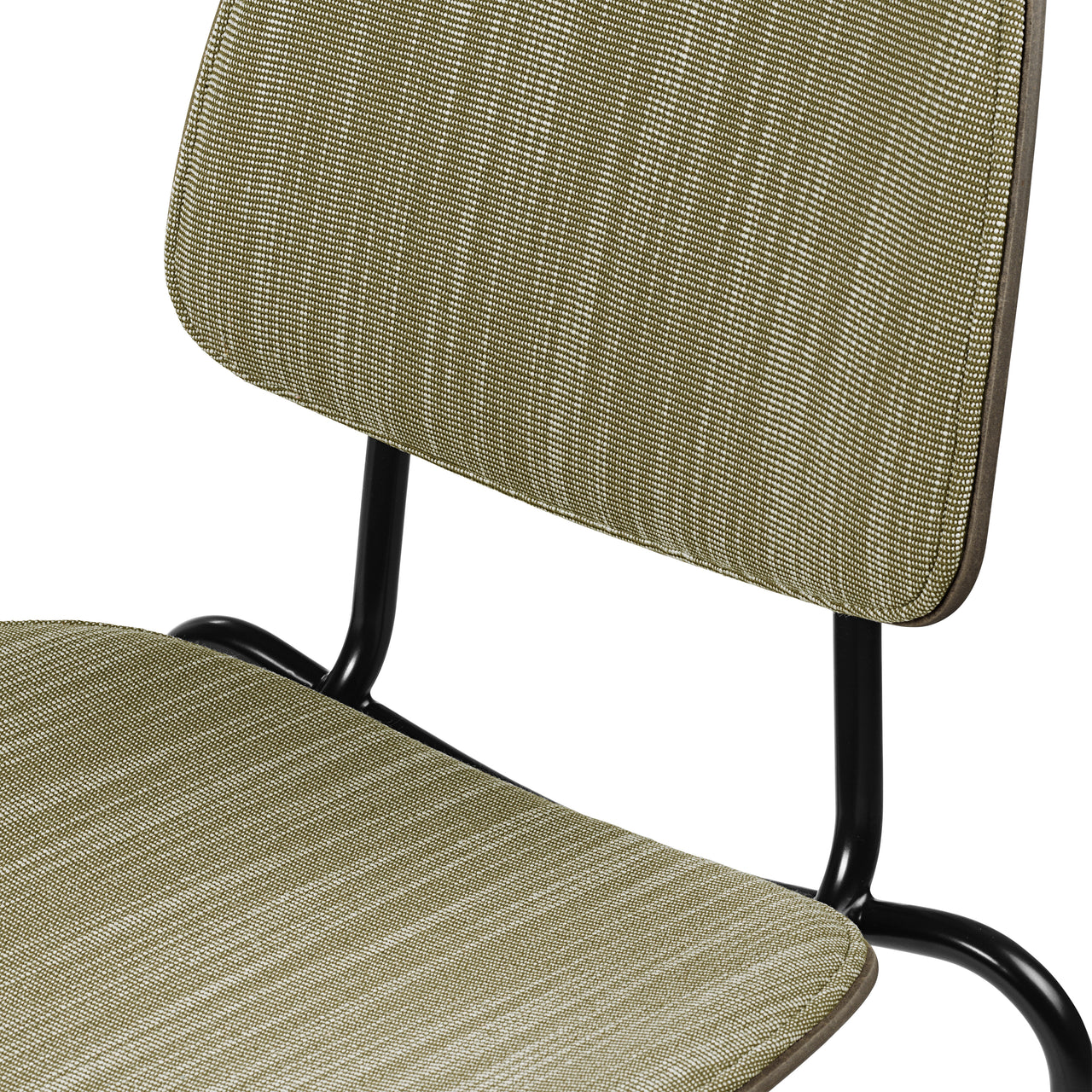 The Compound Dining Chair features a frame made from 20% recycled steel, supporting a seat and back crafted from Matek®—a proprietary material that blends coffee shell waste, wood waste, and industrial plastic waste. Designed by OEO Studio, the chair's minimalist structure offers comfort suitable for both private and public settings. It is available in various Matek® blends, with front or seat upholstery, and is stackable up to four chairs.