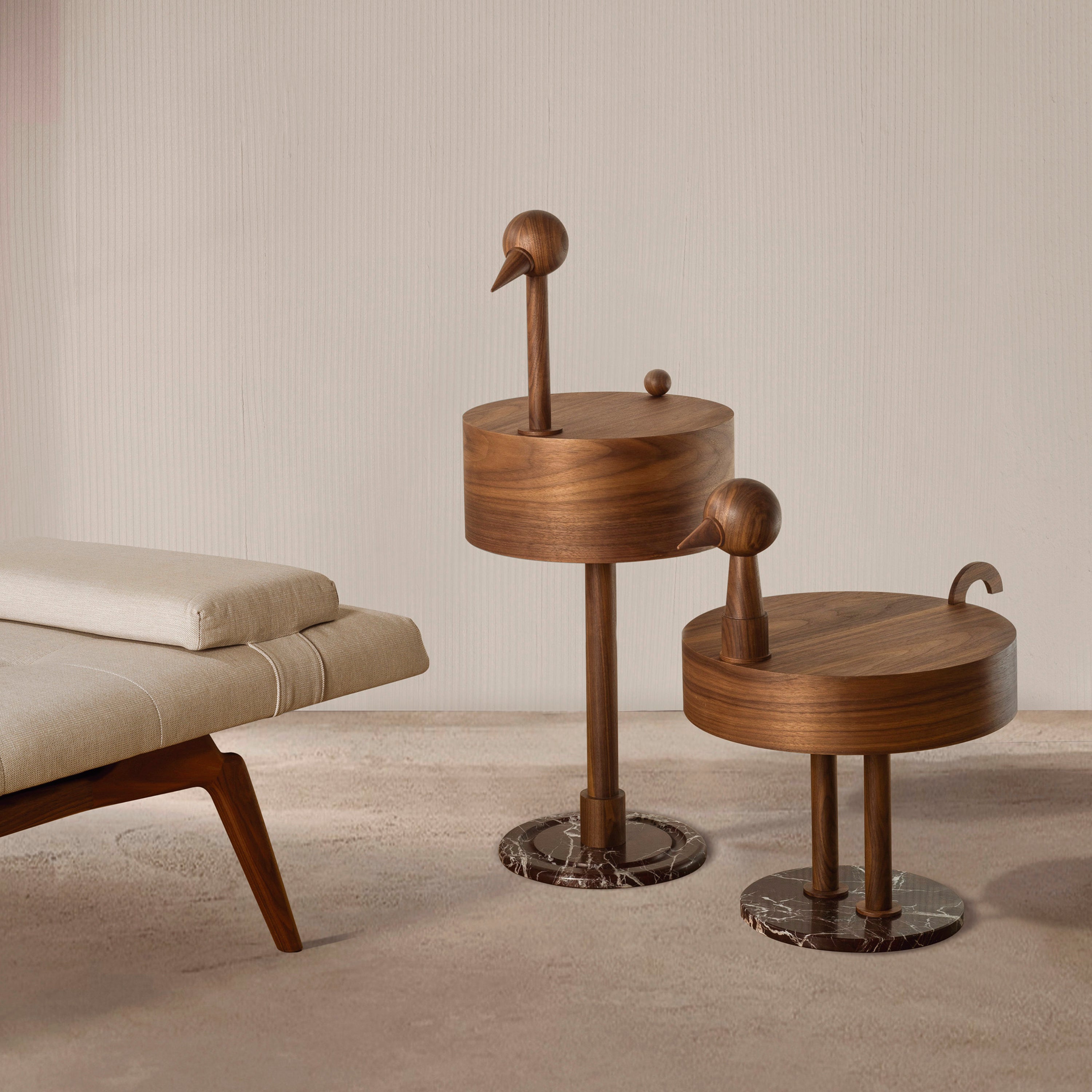 Literally translating its name from the Latin for “rare bird, Mermelada Estudio transforms an everyday object into an artistic statement-piece. An eccentric take on cubist style, the side table renders its geometric, avian-inspired shape in rich walnut with the flourish of a Rosso Levanto marble platform base. Beautifully crafted by Barcelona’s Nomon Home, it’s offered in dual sizes of differing heights — to place singly or in a whimsical pairing.
