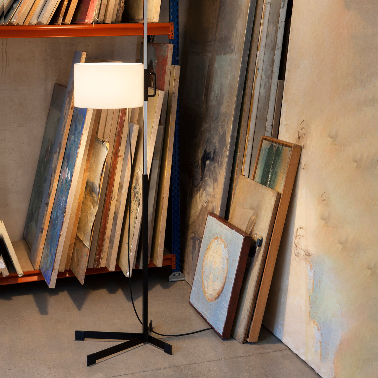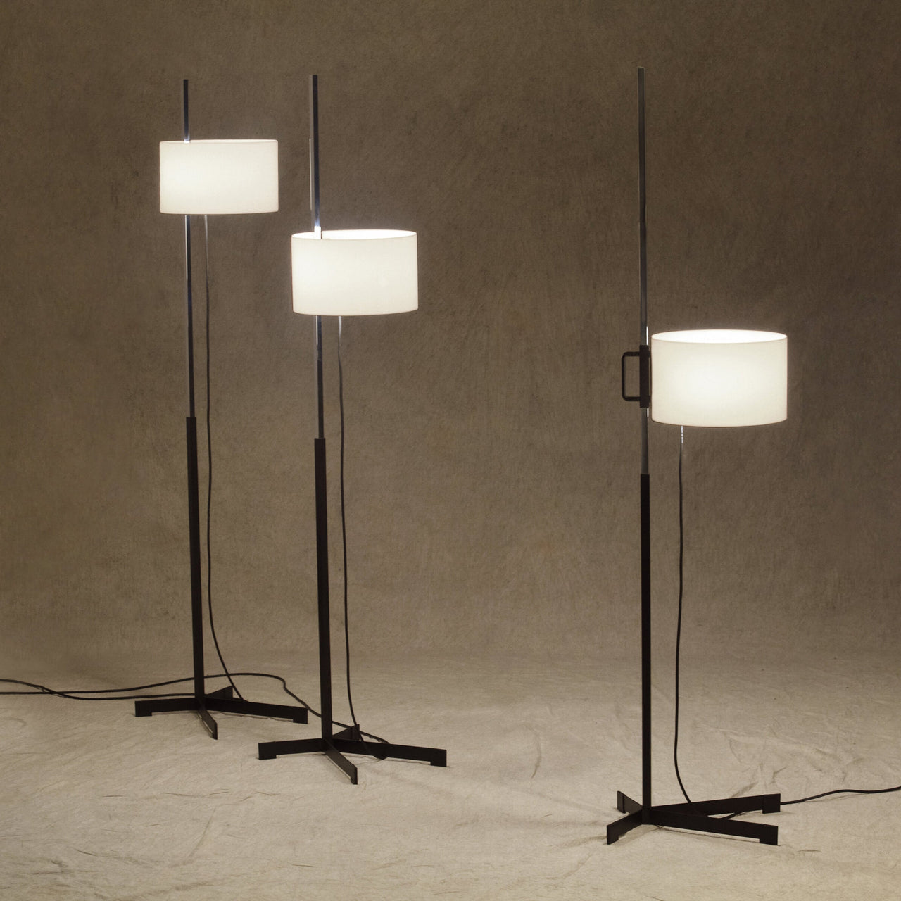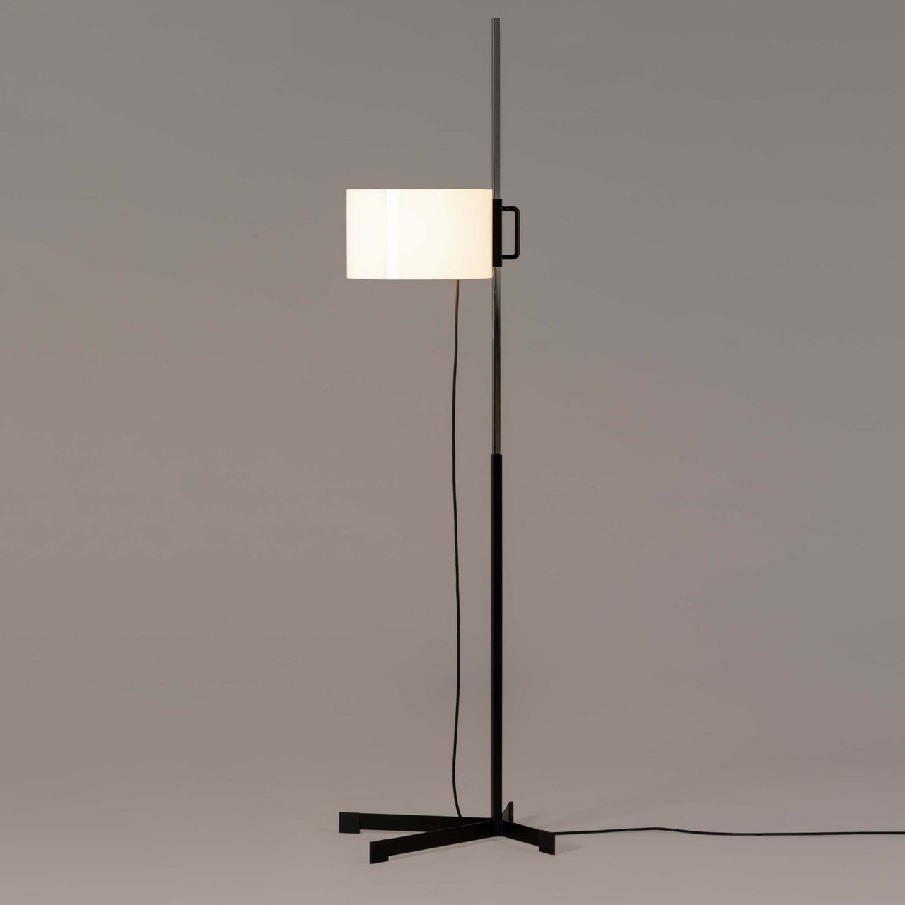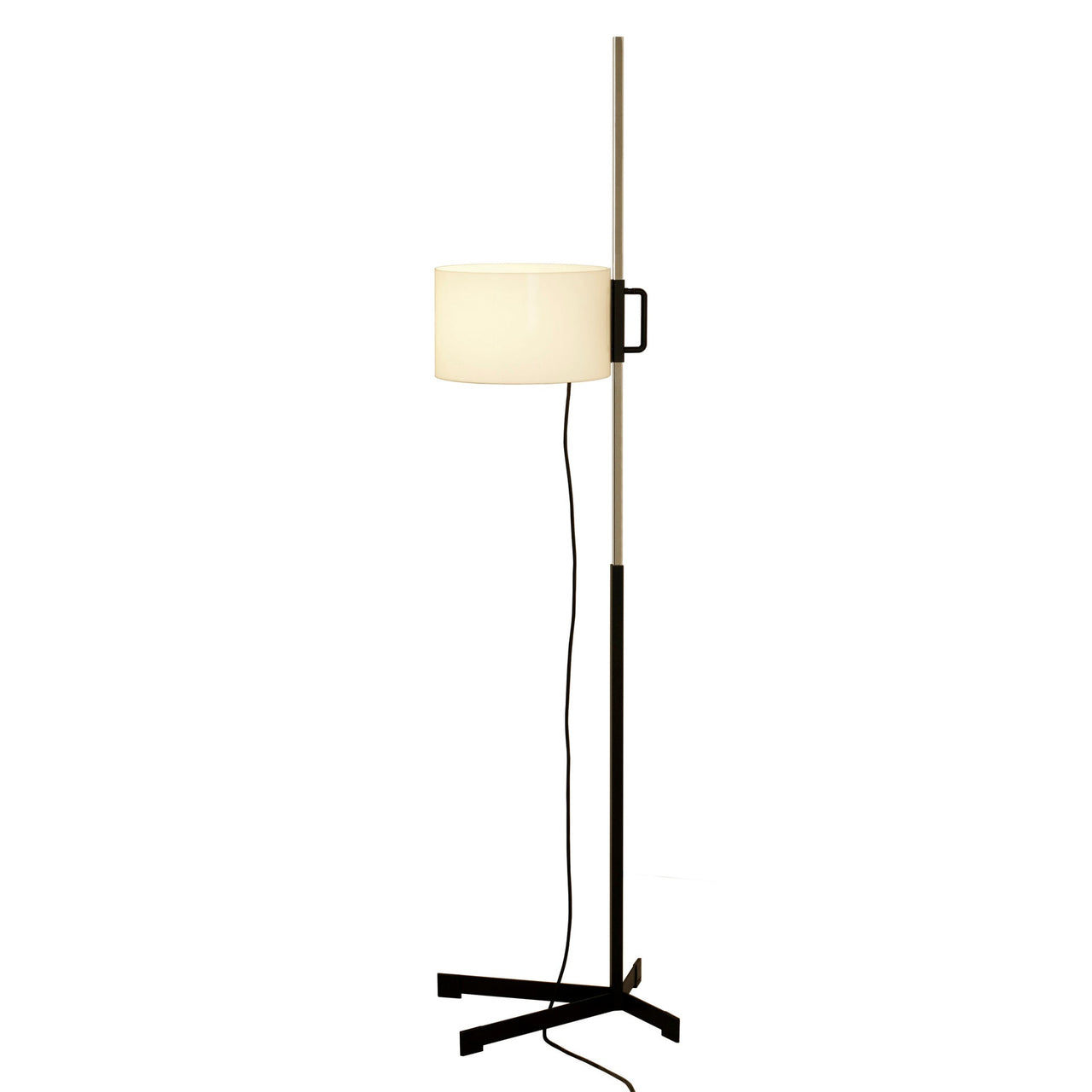 Honoring its 50th anniversary in 2011, Santa & Cole released the definitive updated version of Barcelona design legend Miguel Milá's iconic floor lamp. Highly acclaimed at its debut, TMC retains the original 1961 adjustable shade in white acrylic that can be moved up and down the slim metal structure, with the upper half chrome-plated and lower half and footed base in black. Providing evenly diffused LED illumination, the light is switched on/off by pulling lightly on the cable.