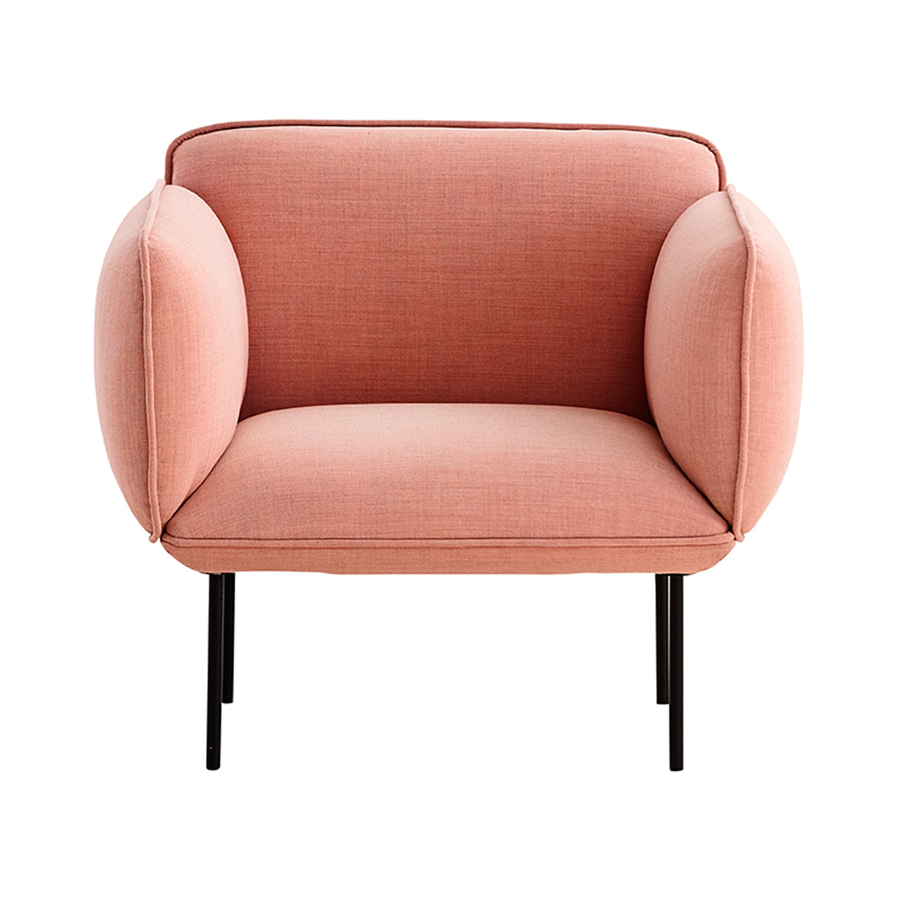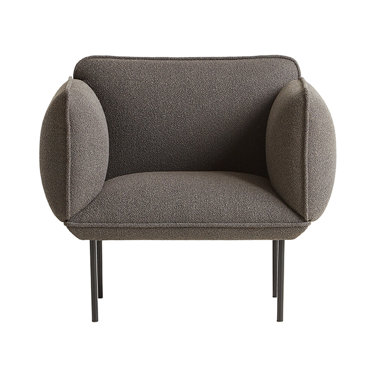 Nakki's generous proportions make it a natural for the lounge chair version in the series from Danish design brand Woud. Voluminously rounded contours promise hours of comfortable sitting with ample yet firm padding. Finnish design star Mika Tolvanen contrasts the plump profile with slender metal legs in a striking juxtaposition of minimalist elements.