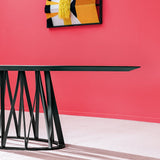 The look of designer Florian Schmidts oval dining table was inspired one day by the accordion folds of his collapsible wood yardstick. Expanding on the notion, Accos solid-wood geometric structure gives the table a solid base but retains an elegantly airy appearance. Available in varied finishes of walnut, oak or ash, its topped with an oval in either wood or several travertine-like ceramic selections. Made in Italy by Miniforms.