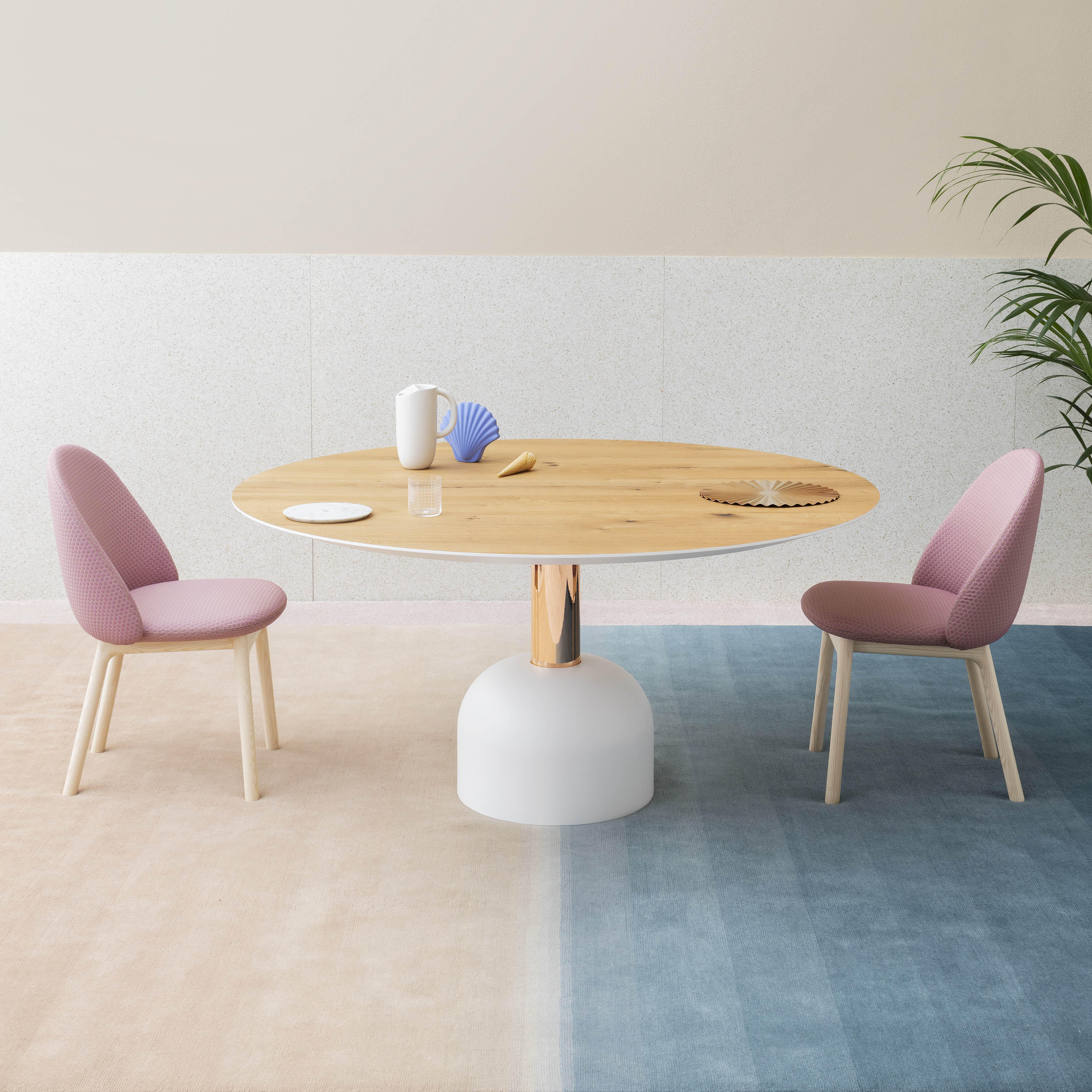 A bistro-size version of Miniforms' colorful Illo is perfect for dinner for 2 or to grace smaller living spaces. The quirky pedestal design with an overemphasized base and gleaming metal column recalls the Italian '80s and its Memphis design era. With Illo's signature mix of available finishes and colors that can be chosen to a heart's content, the round tabletop comes in a choice of smooth lacquer or tactile wood veneer.