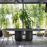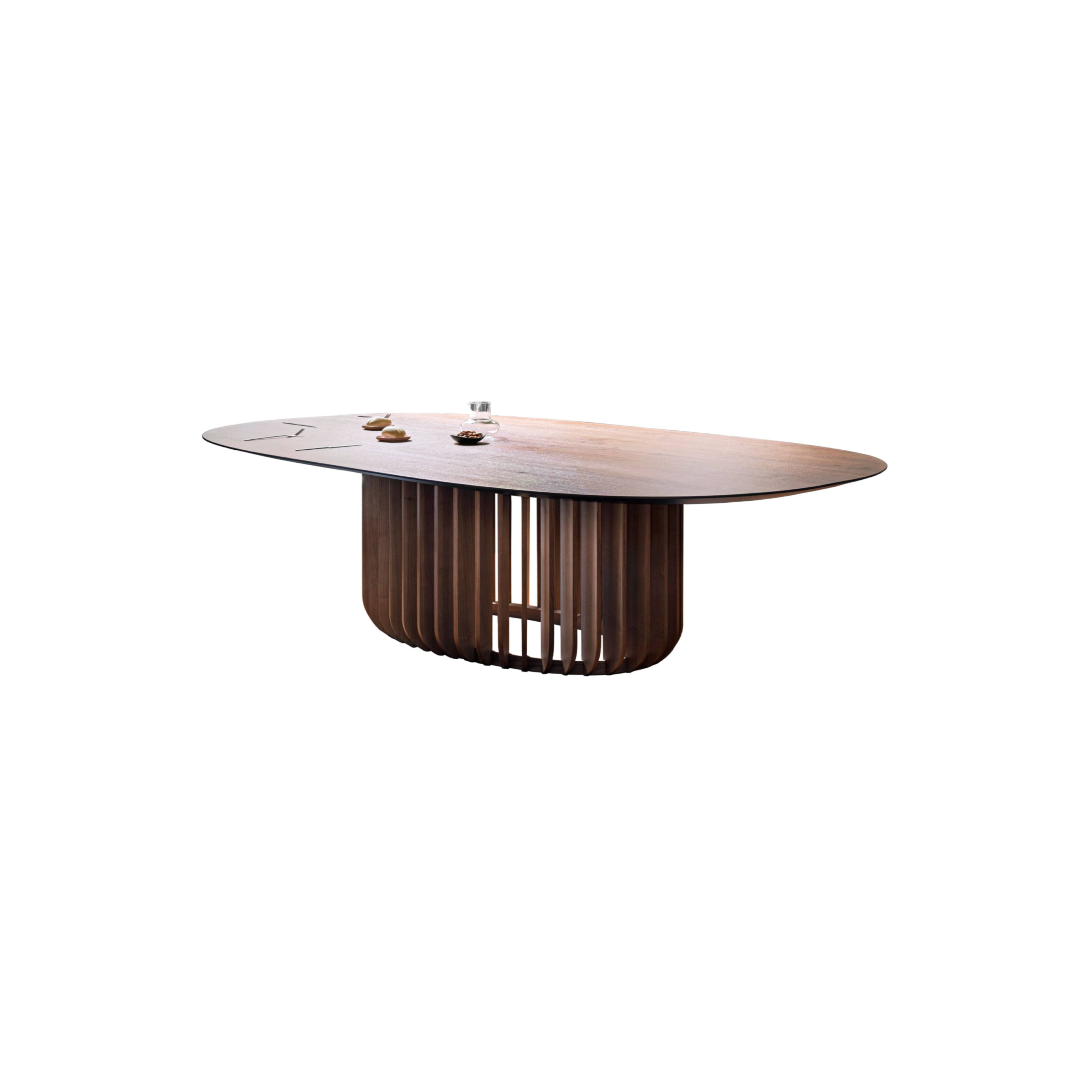 Hewing to its rounded proportions even in a rectangular version, Juice mingles a sense of grandeur with a meditative calm. The slatted wood base, said to be suggested by a juicer, takes on an expressive form in the hands of Florence E-ggs for Italian maker Miniforms. Balancing positive and negative space with its slatted wood scheme brings a lightness that belies the tables impressive proportions. Choose from the boldly scaled tabletop variations in solid-wood finishes or a range of marbleized patterns in porcelain ceramic.