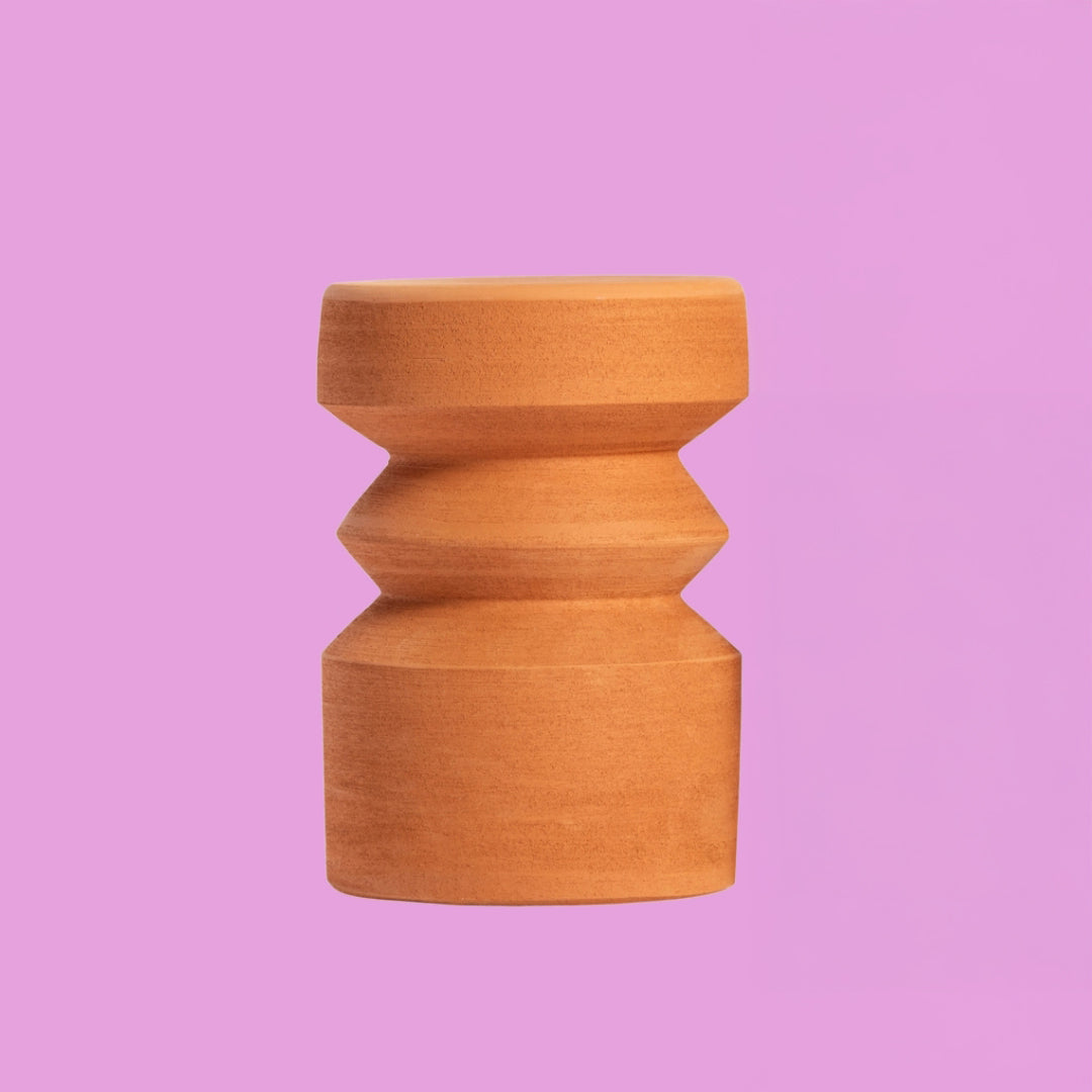 Crafted from hand-lathed terracotta, the Mila Outdoor Side Table features a cylindrical profile punctuated by geometric patterns, offering a distinctive presence in outdoor settings. Designed by a graduate known for his innovative approach to traditional materials, the table reflects a commitment to monomaterial design. Its sharp-edged silhouette echoes the radical design movements of the 1960s, giving it a unique character that sets it apart from conventional outdoor furniture. The use of terracotta not only ensures durability but also adds natural warmth, making it well-suited for various outdoor environments.