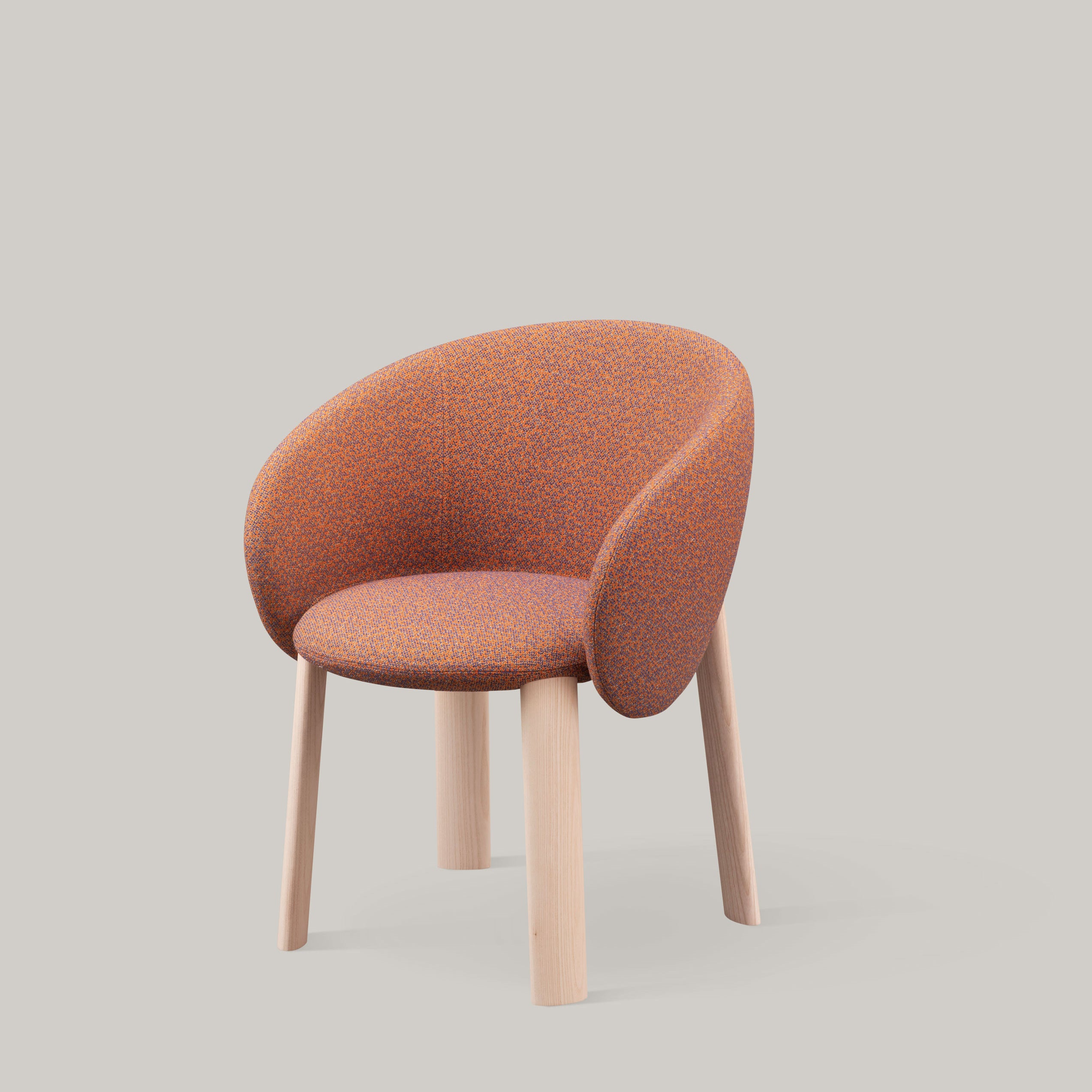 Smoothly splayed legs in a choice of wood finishes add a tactile note to Nebula, with a swirl of cloudlike presence that inspired its celestial name. From design E-ggs, the armchairs invitingly encompassing contours feature upholstery in a range of premium textiles over its comfortably plumped polyurethane shell.