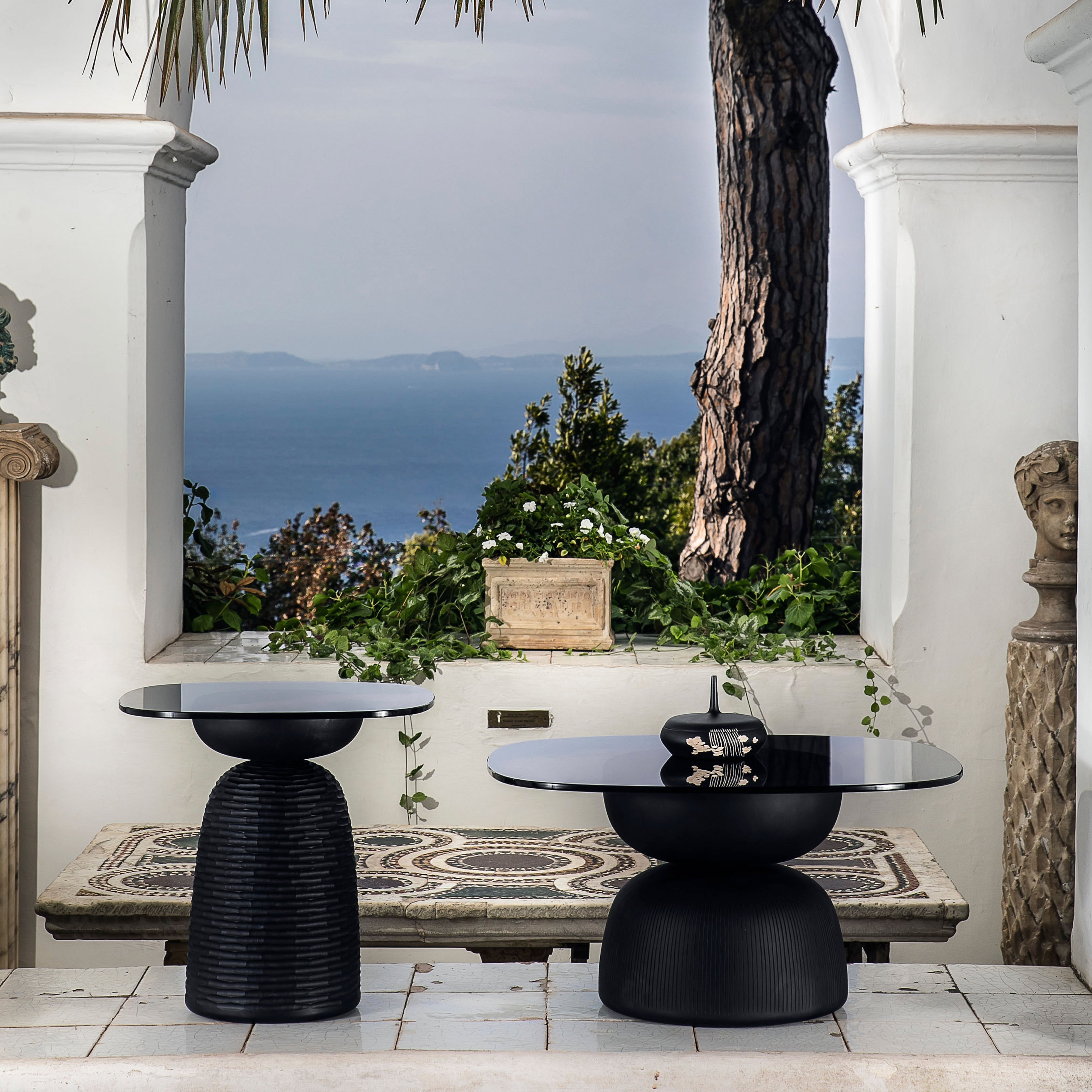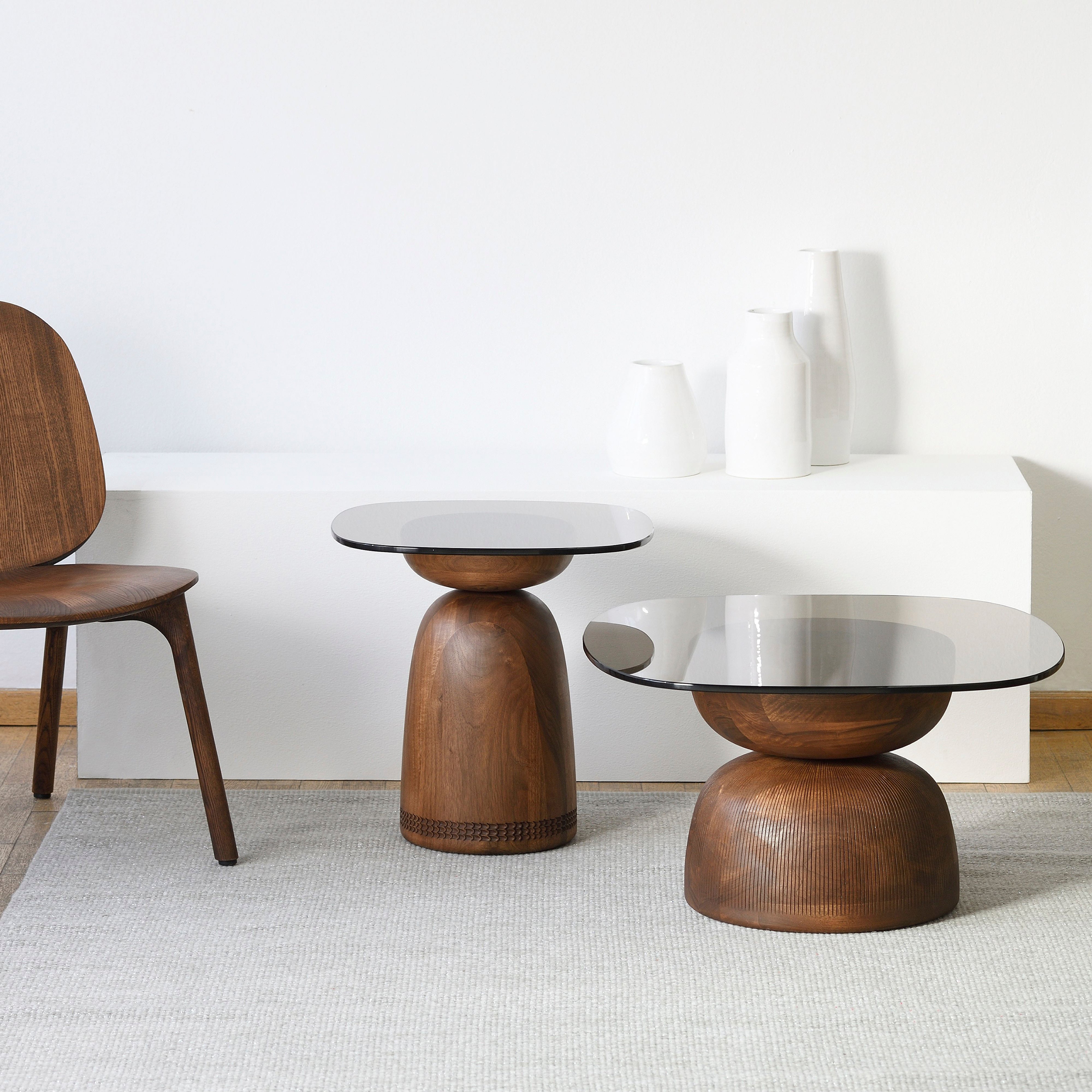 With its low coffee table, Bosnian brand Zanat extends its series that features a rounded wood base with artisan carving that builds on the brand's skillful heritage. Swedish designer Monica Förster dictates a choice of sustainably forested solid maple with a black stain and matte glaze or rich walnut with an oiled finish for her sculptural piece. With a choice of full or border rows of surface hand carving, the wood base is topped with a rounded pane of smoky tinted glass.