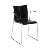 With the addition of short armrests, this extra-wide version of Danish designer Erik Magnussen's stacking chair also gets an easily movable, weight-distributing sled base. Chairik XL's expanded compression-molded seat offers prime back support without pressure on the spine to suit numerous sitting positions. The polished-chrome tubing base and similarly gleaming aluminum arms aptly complement a variety of seat options in plastic, melamine, woody veneers, lacquer finish or translucent lazure.