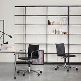 Adding a comfortable armchair, Engelbrechts offers the wider-seat Chairik XL with a suite of workaday features—a 5-star swivel base, double-wheel casters and height adjustment. Yielding back support without added pressure on the spine, Erik Magnussen's compression-molded seat design easily accommodates individual sitting positions. With polished-aluminum construction, the chair comes in plastic, melamine, veneer varieties, lacquer finish or translucent lazure hues.