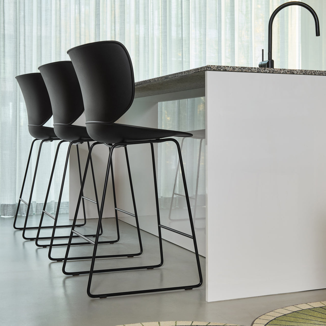 The Hana Bar and Counter Stool's petal-shaped backrest and flowing lines, inspired by a blooming flower, brings a sculptural design to elevated seating areas. The sturdy metal base is available in black or chrome finishes. Sold in sets of two, the Hana Bar Stool is suitable for residential and commercial use.