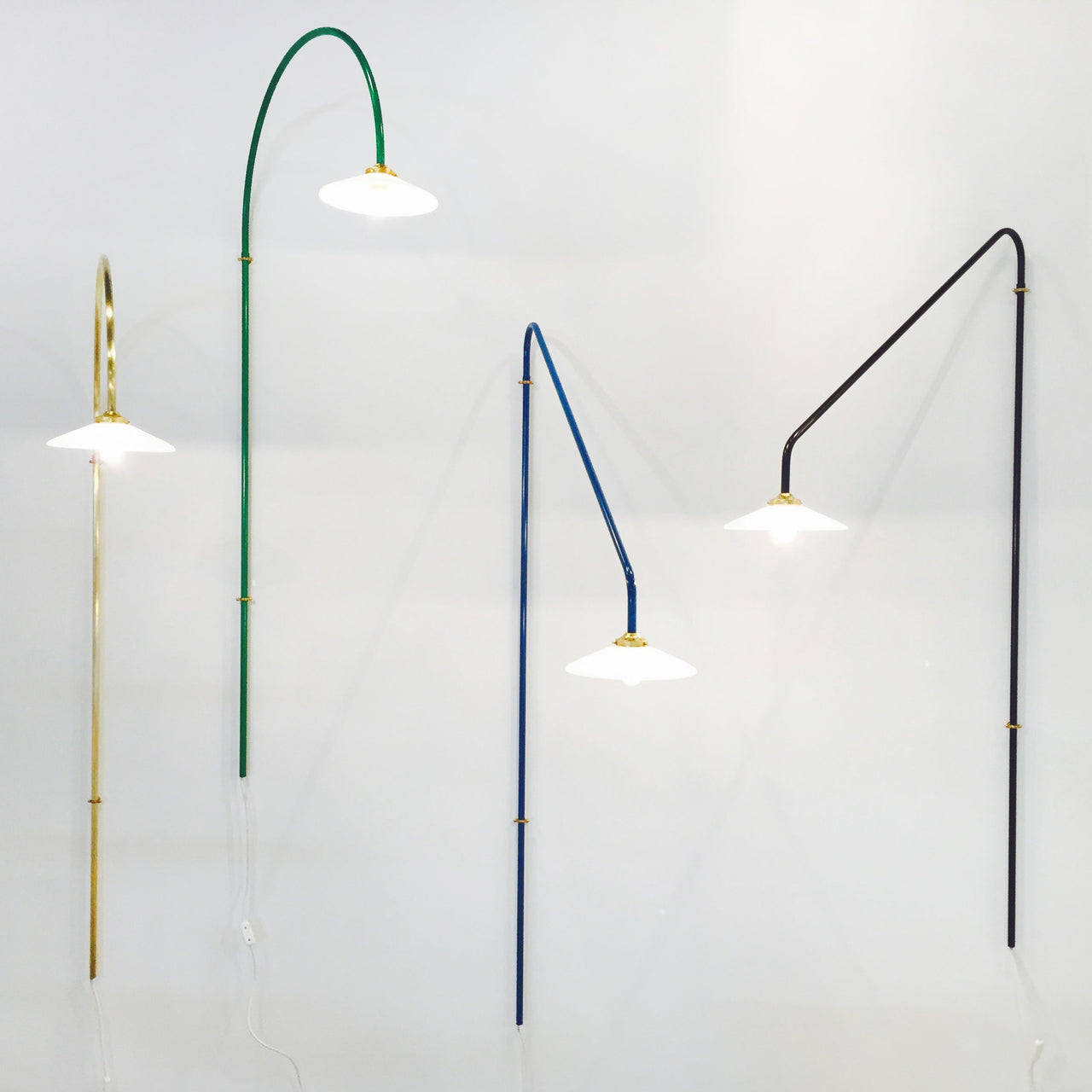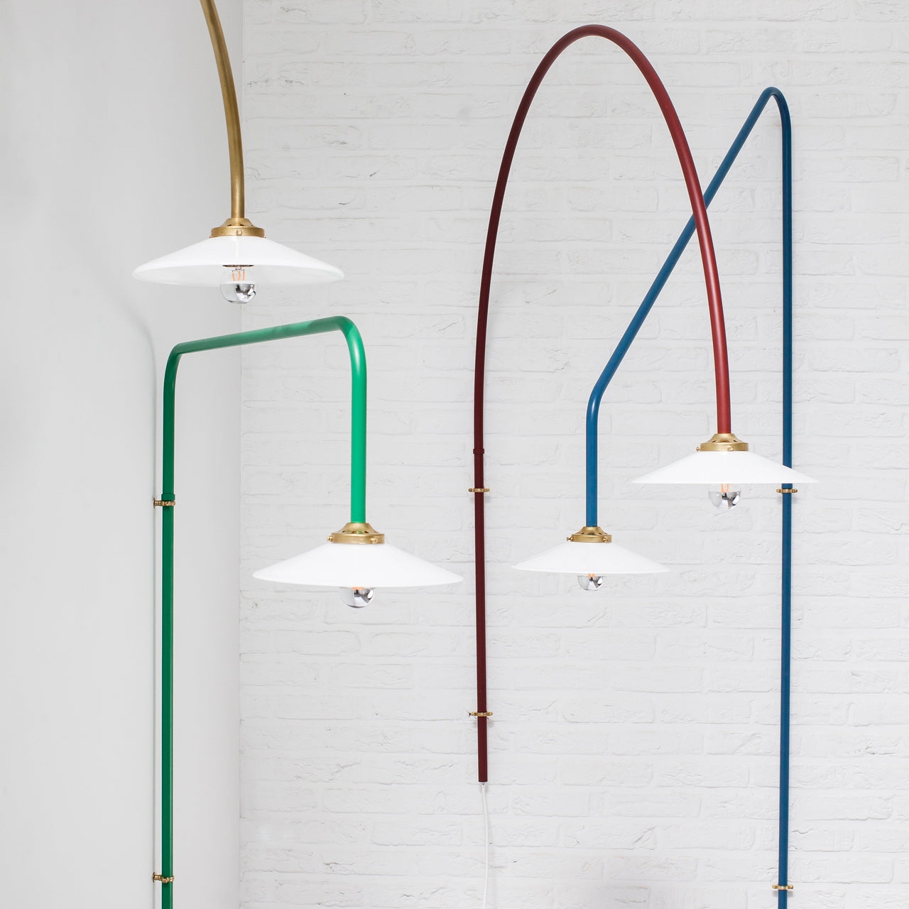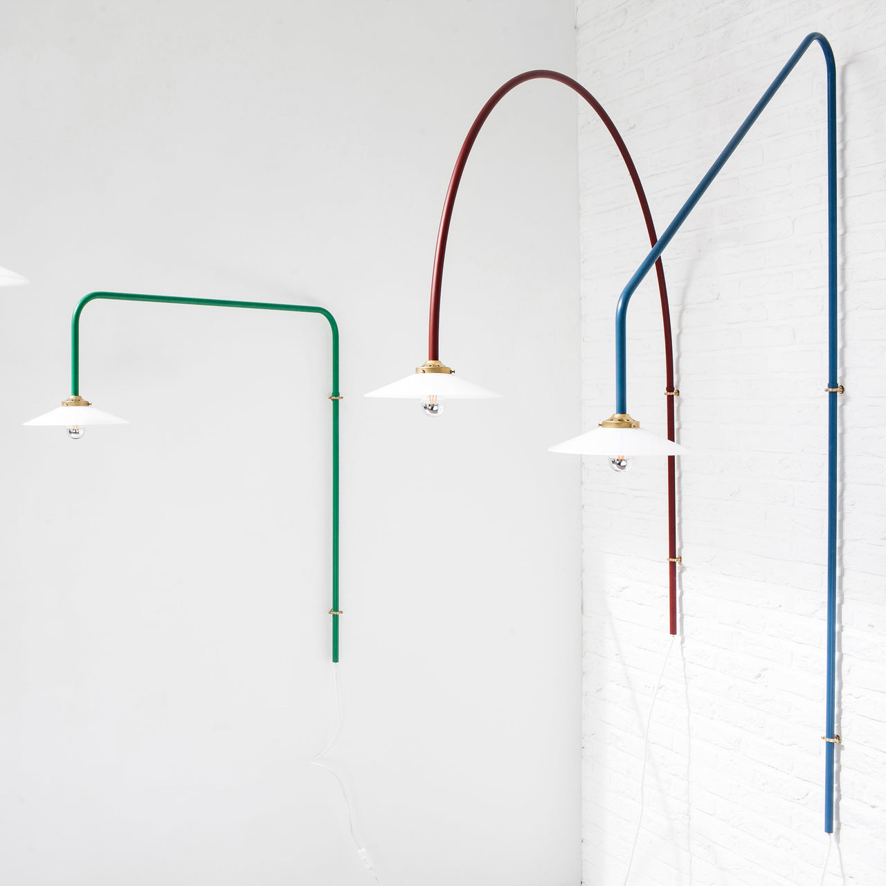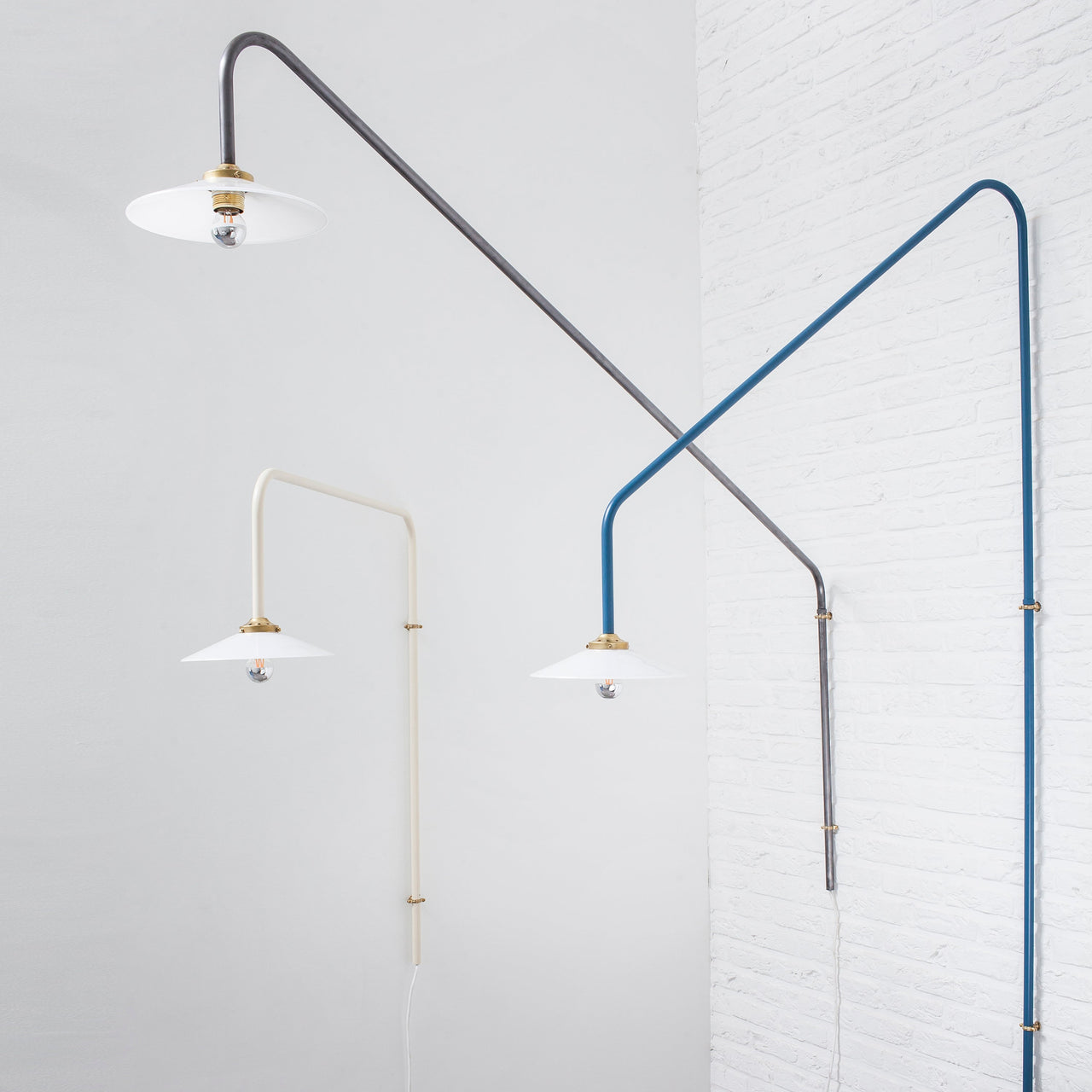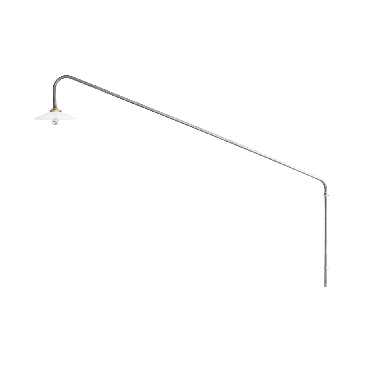 Muller Van Severen’s initial version of their wall-mounted pendant makes a dramatic upward slant. The series was conceived the duo needed a dining table light in a room without a ceiling outlet. The linear fixture makes a statement without dominating a space and is crafted in steel tubing in brass, black or several curated colors.