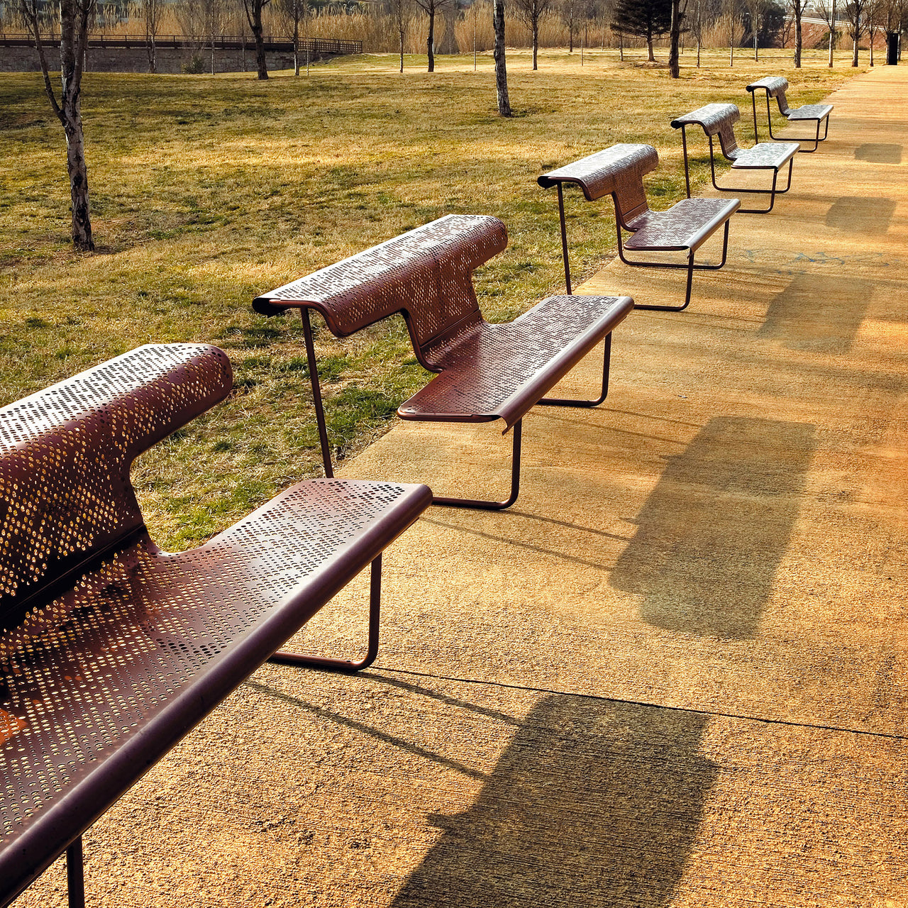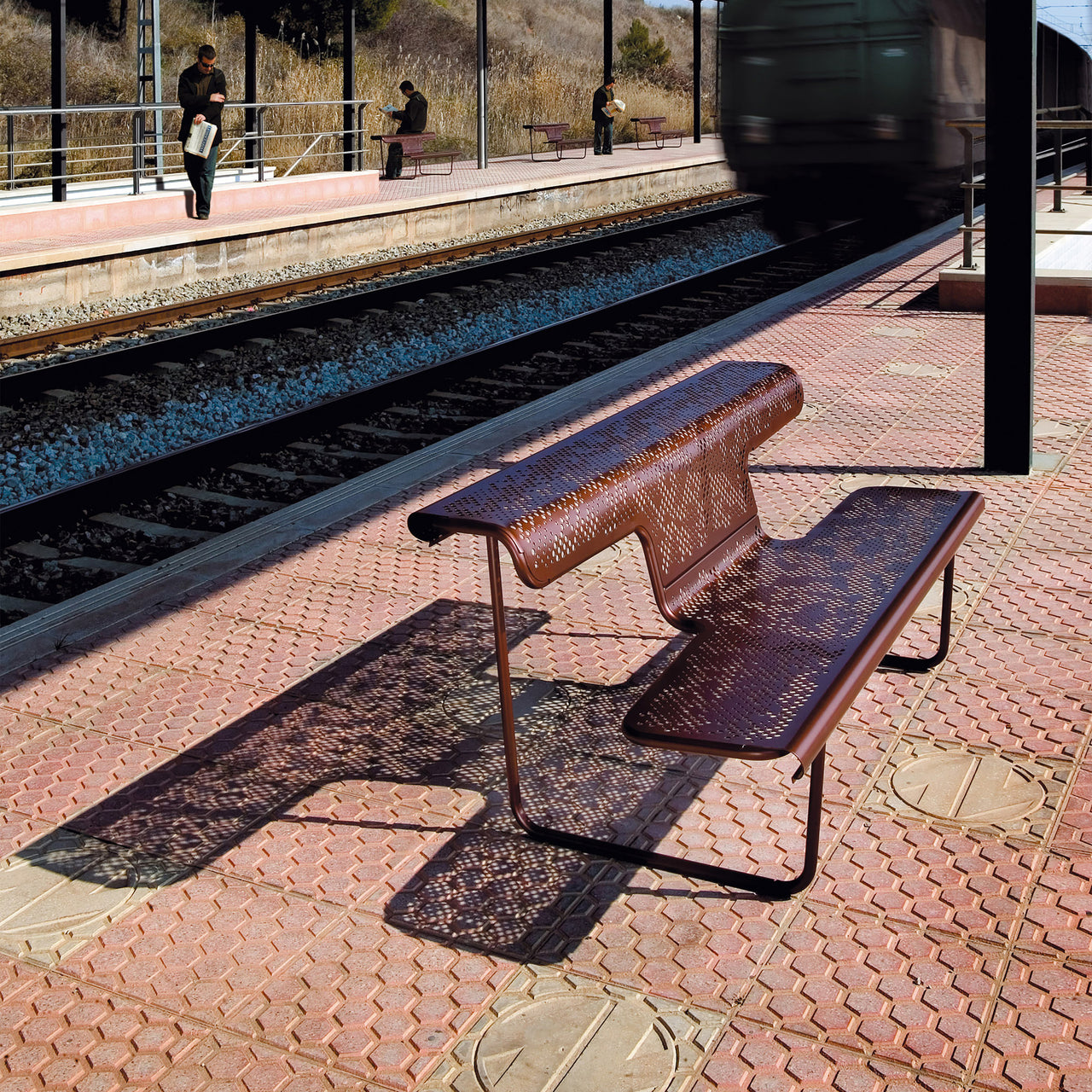 This steel bench is designed for use in both public and private settings, with a perforated seat that promotes airflow and allows water to drain efficiently. The raised, angled backrest also functions as a convenient surface for writing or casual dining. Finished in bronze or textured silver, the bench can be securely fixed to the ground for added stability. Tubular supports and carefully placed perforations enhance both structure and comfort, contributing to its thoughtful, durable design.