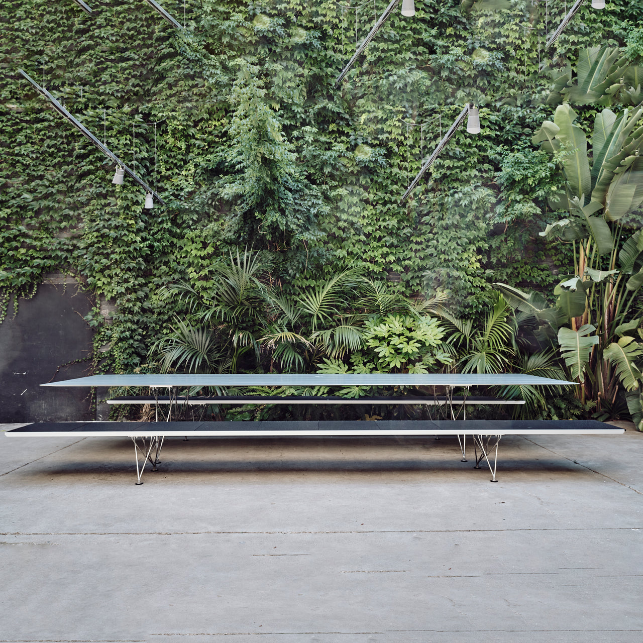 A streamlined aluminum bench with a subtly curved seat. Steel-rod legs provide durability for indoor and outdoor use. The precise construction and clean silhouette allow for varied configurations.