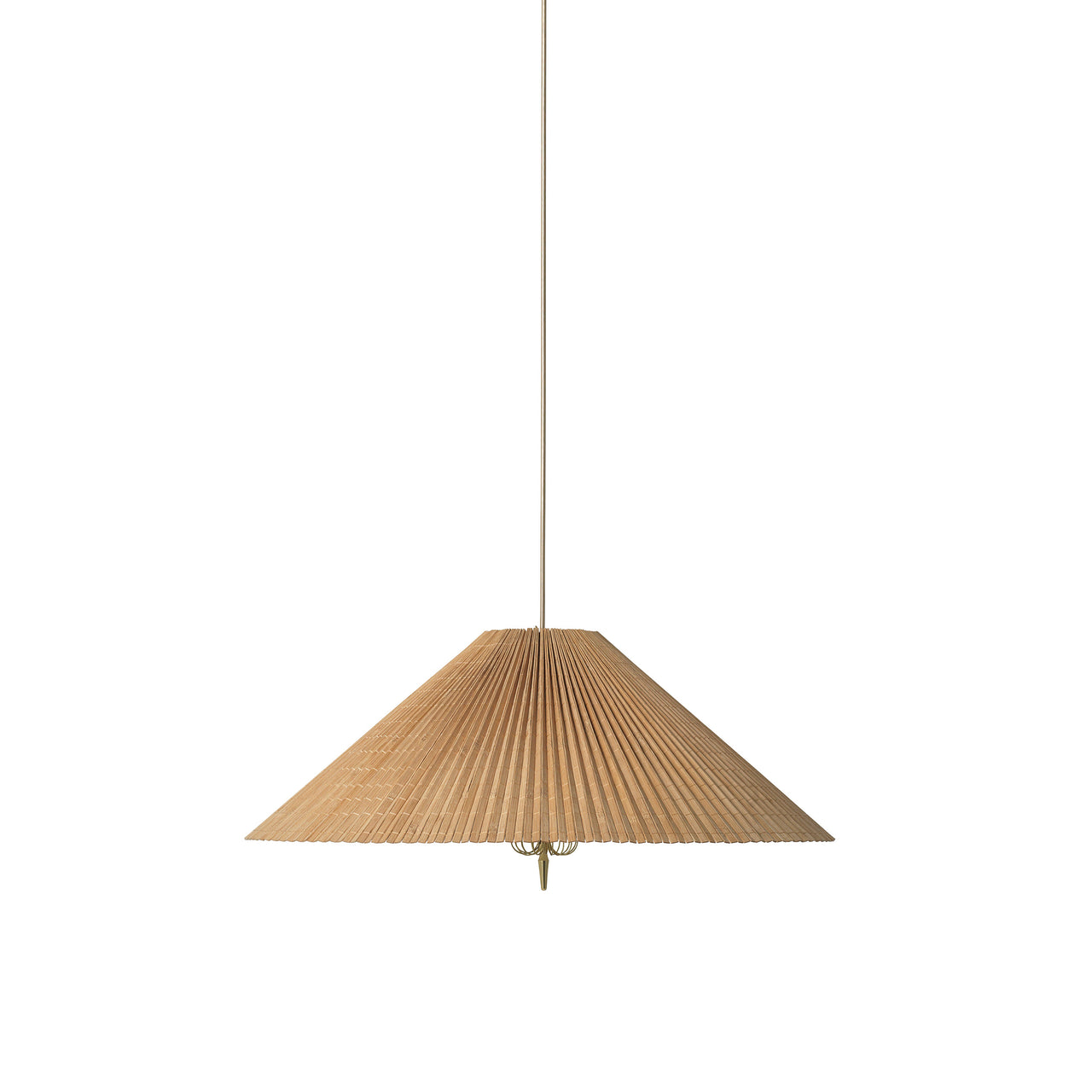 Light filters through hand-sewn bamboo slats that shape the conical shade, gently diffused by a linen liner to create ambient warmth and a subtle upward glow. Polished brass details accent the natural materials with understated elegance. A fabric diffuser beneath the bulb softens the light, complemented by a decorative brass flourish.