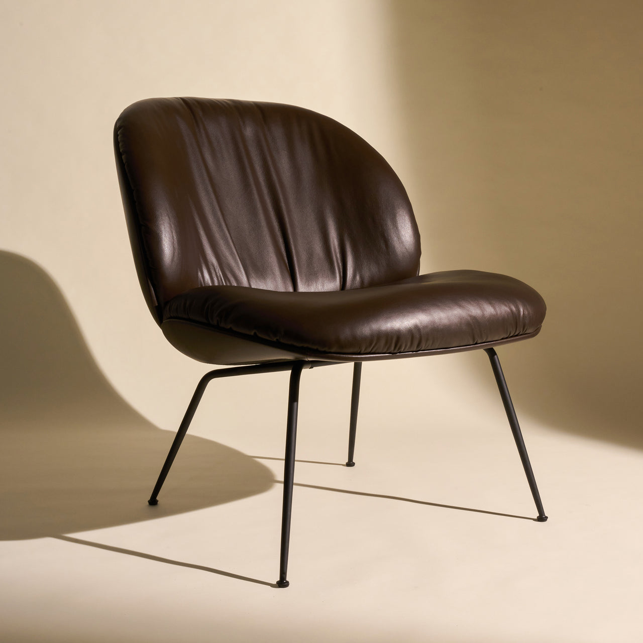 The Gubi Beetle Soft Lounge Chair combines organic form with inviting comfort. Its molded veneer shell is fully upholstered with CMHR foam and polyester wadding, creating a soft yet structured seat that reflects the anatomy of a beetle. Resting on a slender conical metal base. Designed for relaxation, it can also be paired with the Beetle Ottoman for enhanced comfort.