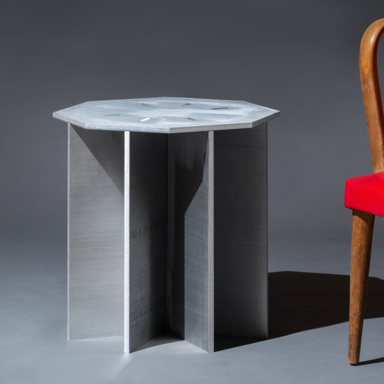 This side table is shaped from eight angled panels joined to form an octagonal base, supporting a solid top with matching geometry. Made from 10 mm aluminium and assembled without fasteners, it offers a sturdy presence. The untreated or satin-coated finish reveals the raw surface of the metal, which naturally develops character over time through exposure and use.