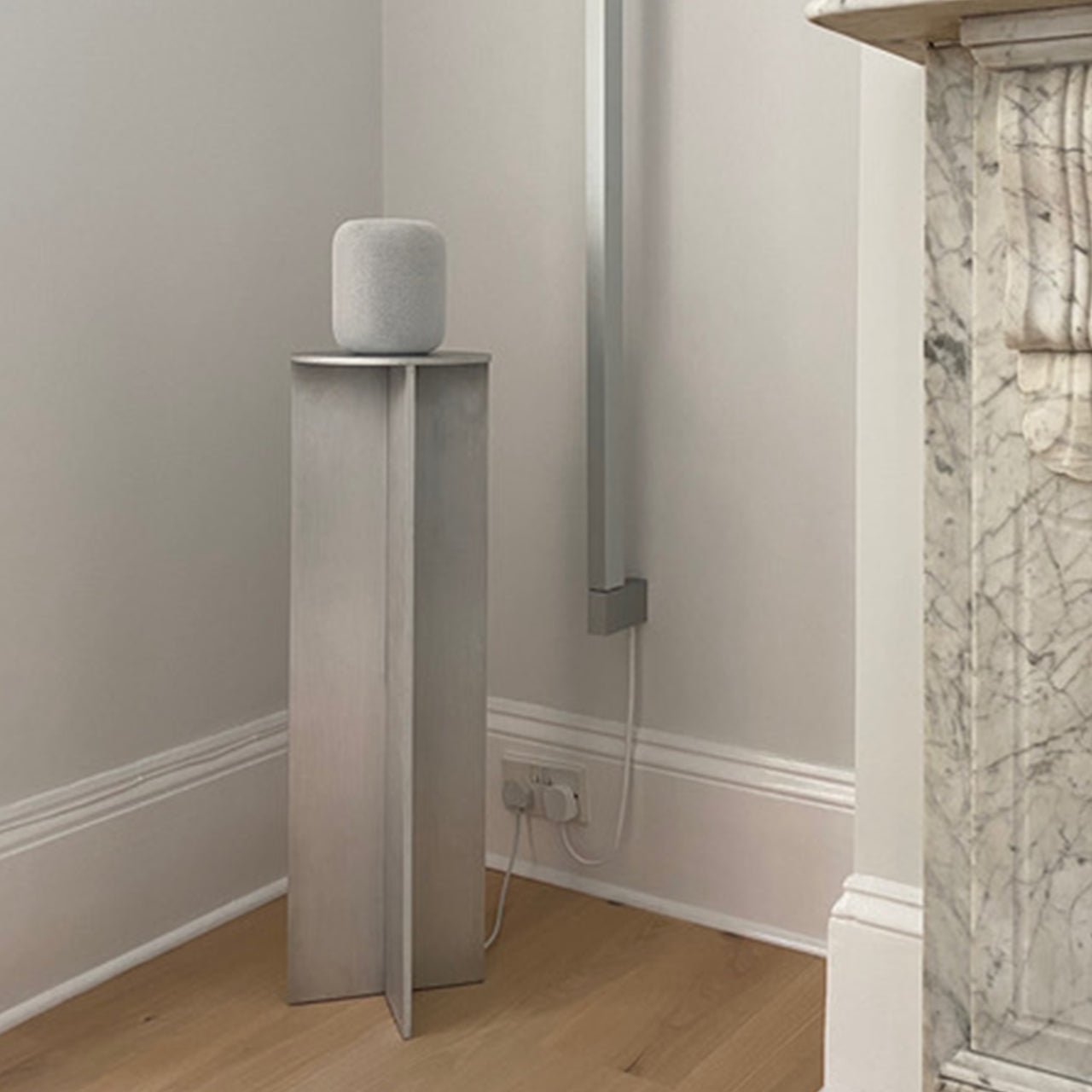 This display column features a tall, narrow profile constructed from 10 mm aluminium, offering a stable platform for placing objects. The surface—available in untreated or coated finishes—is built to handle regular contact, gradually developing a patina that reflects its surroundings and use.