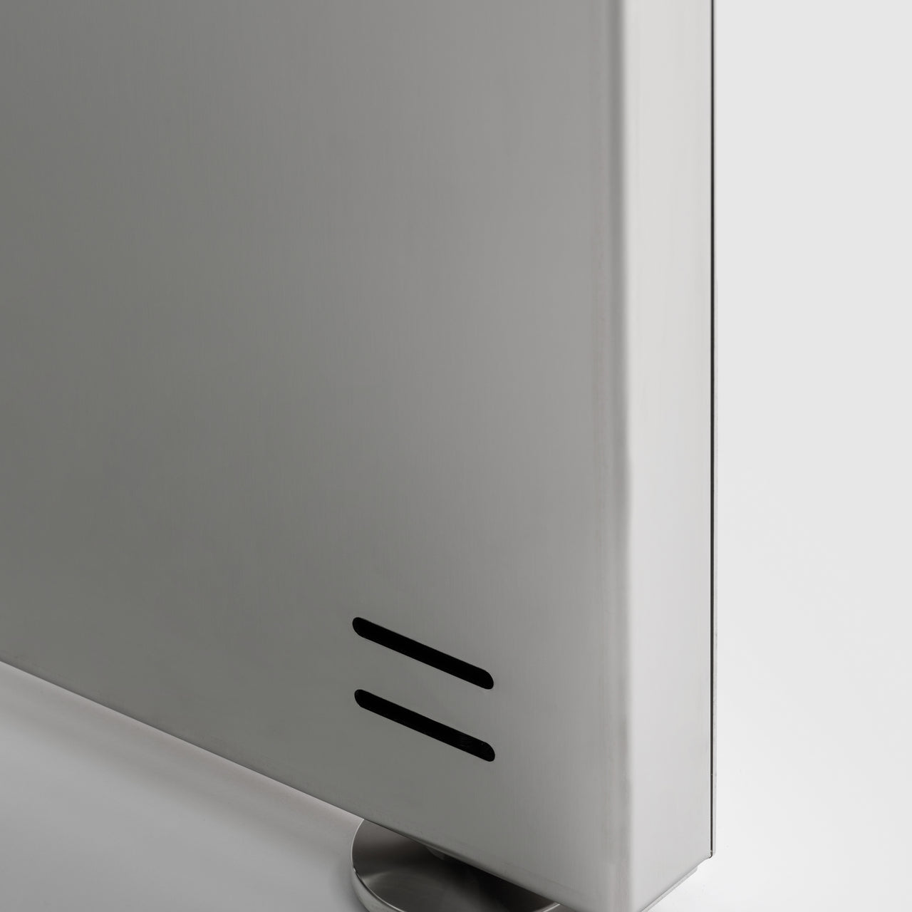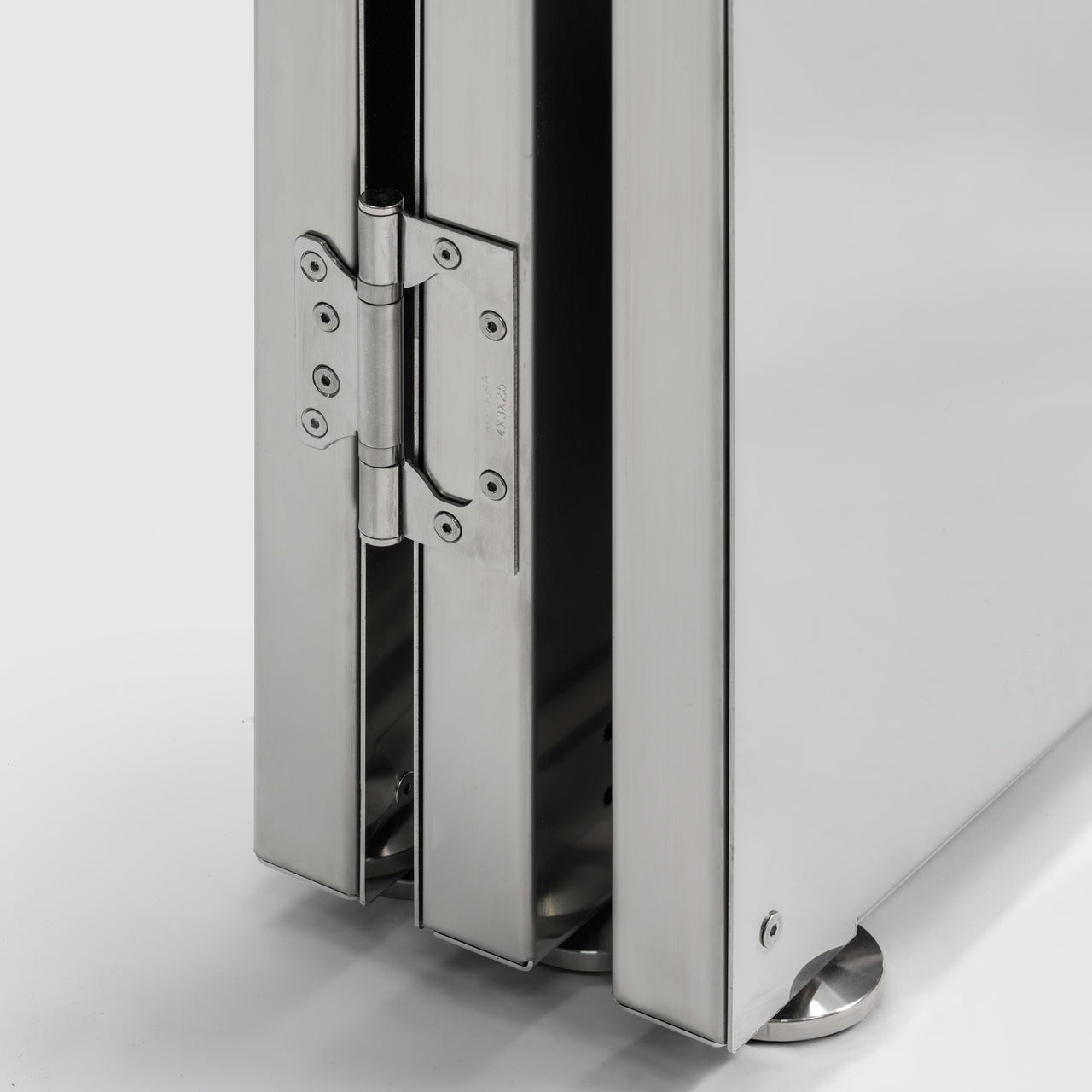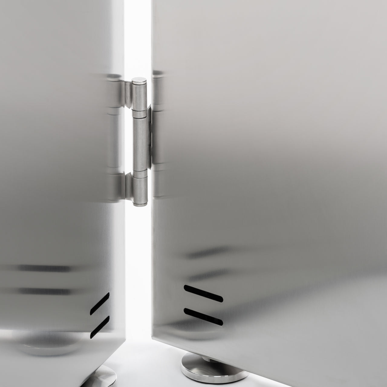 This three-panel metal screen is designed to divide space while remaining understated and durable. Made from 1.5 mm stainless steel with a combination of BA inox and Scotchbrite finishes, the panels are laser-cut and connected by precision hinges using dry-assembly methods. The structure folds smoothly without visible hardware. Its untreated surfaces gradually take on marks and patina through use, revealing the natural qualities of the material.