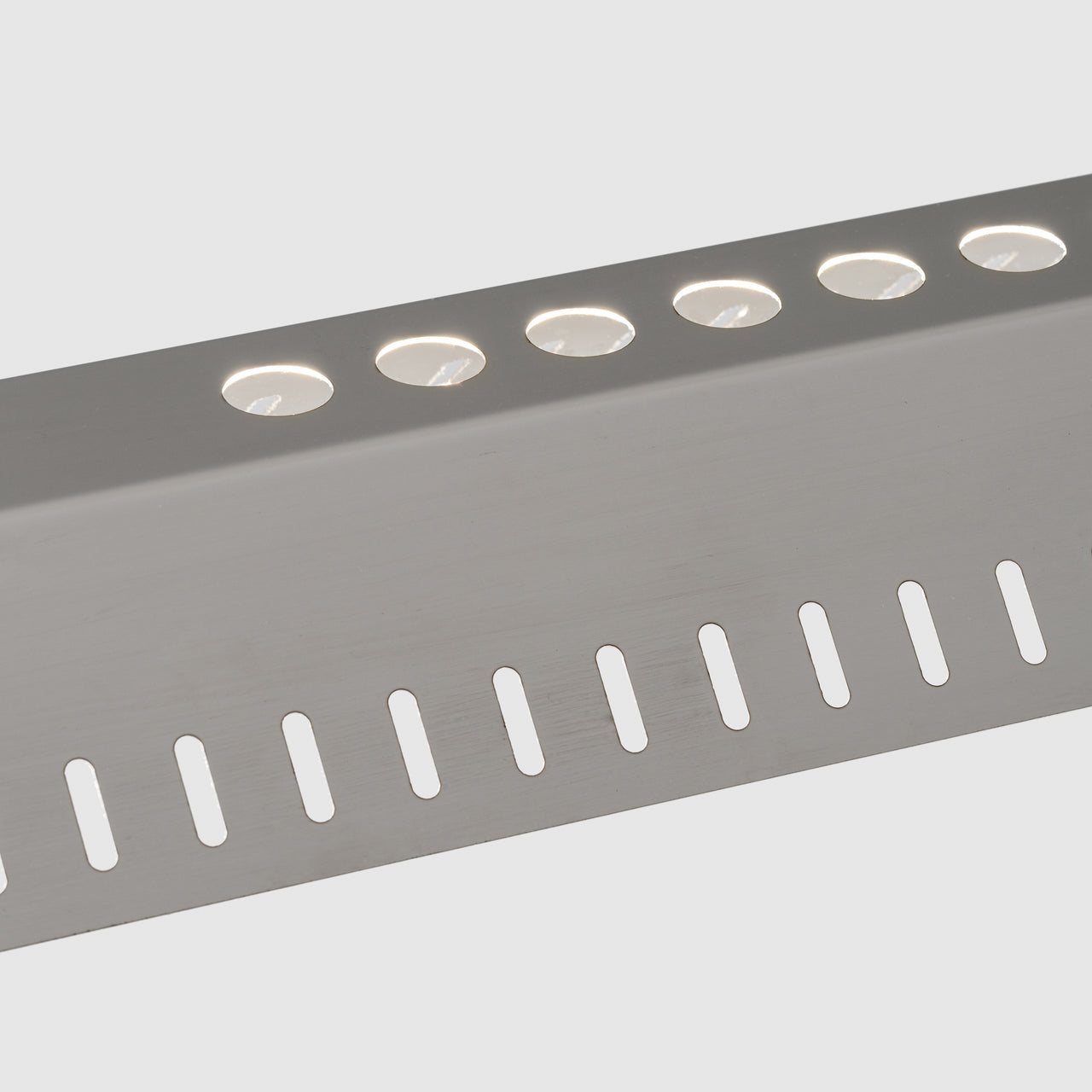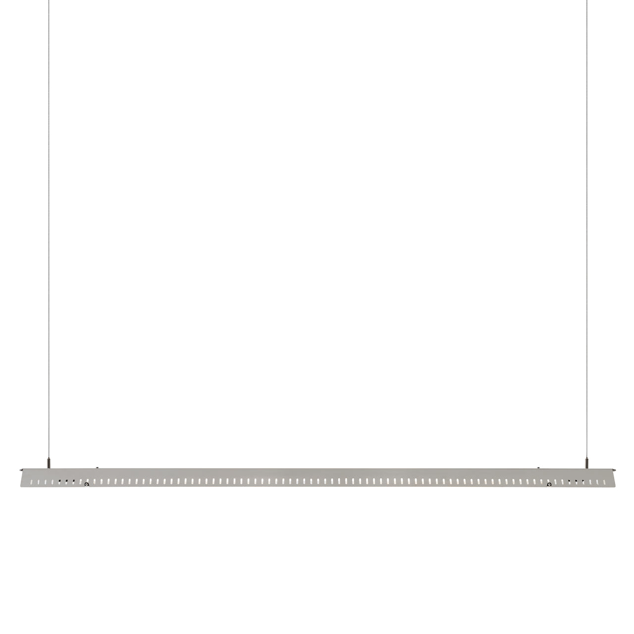 This pendant lamp features a narrow steel body designed to distribute light evenly across long or focused areas. Made from 1 mm BA inox stainless steel using CNC cutting and dry-assembly methods, it is lightweight yet structurally stable. The surface—available in untreated.
