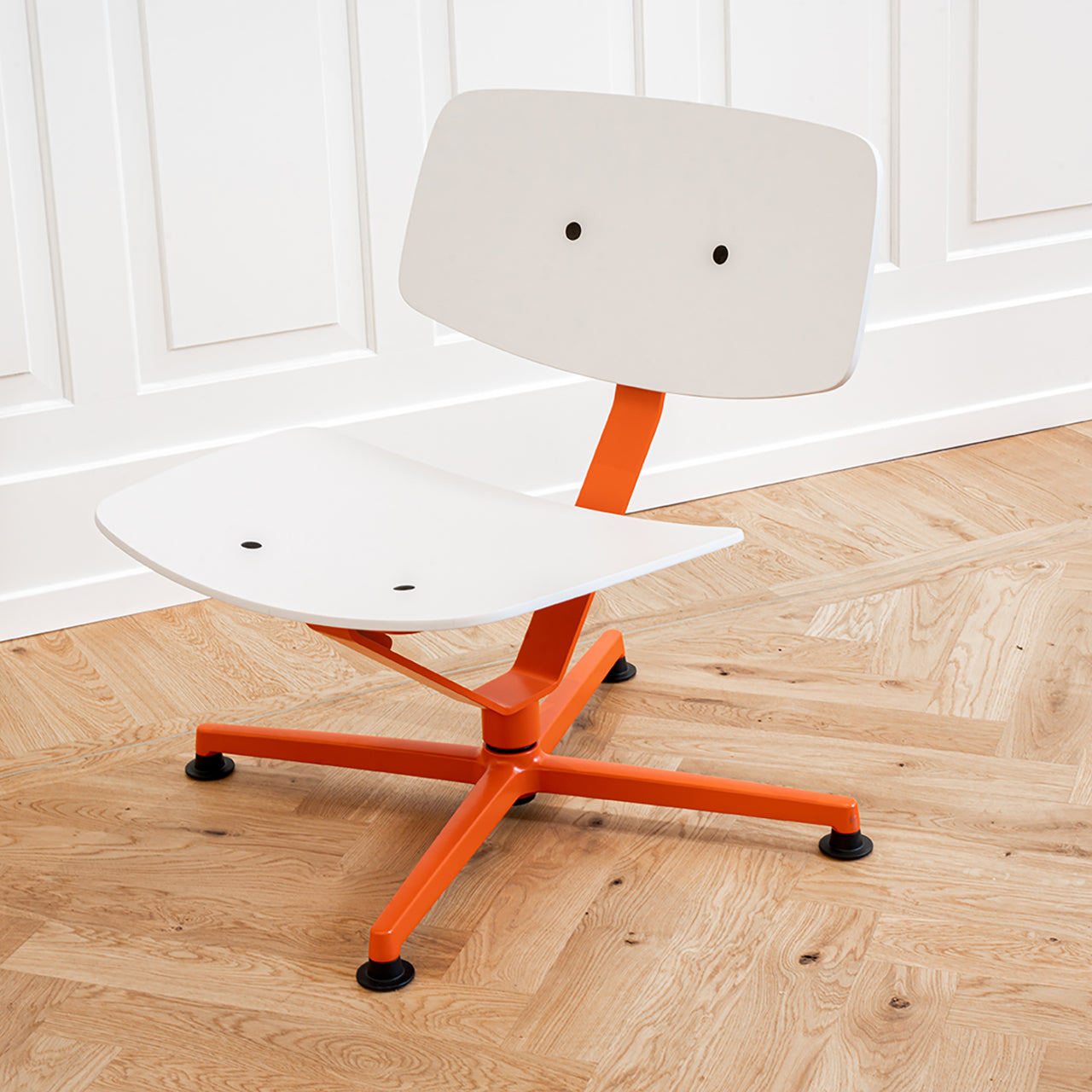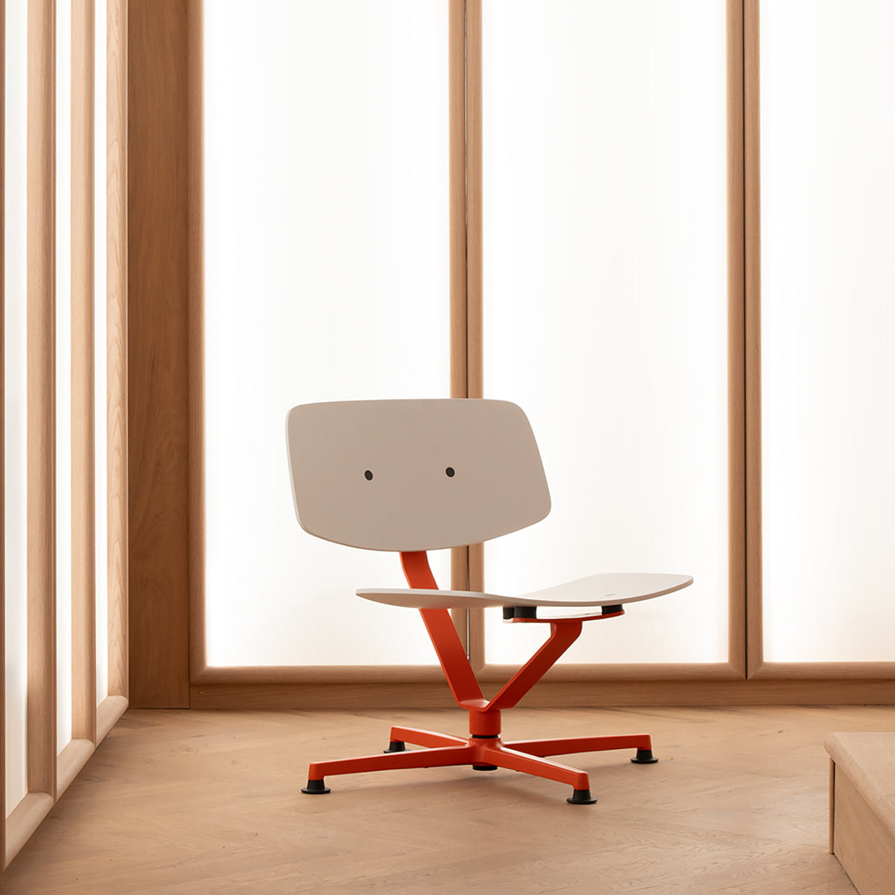 The Arba Lounge Chair + Ottoman pairs sculptural clarity with inviting comfort. The chair is built from two molded plywood shells for the seat and back, joined by a distinctive cross-shaped metal “spine” and set on a die-cast aluminum swivel base. The ottoman mirrors the same construction, creating a cohesive set. Upholstered in wool fabrics or leather, the pieces balance softness with structural precision. A choice of shell and base finishes allows playful contrasts or more subdued expressions. Designed for simplicity and practicality, the Arba set ships flat-packed and assembles with ease, offering a refined design with everyday usability.