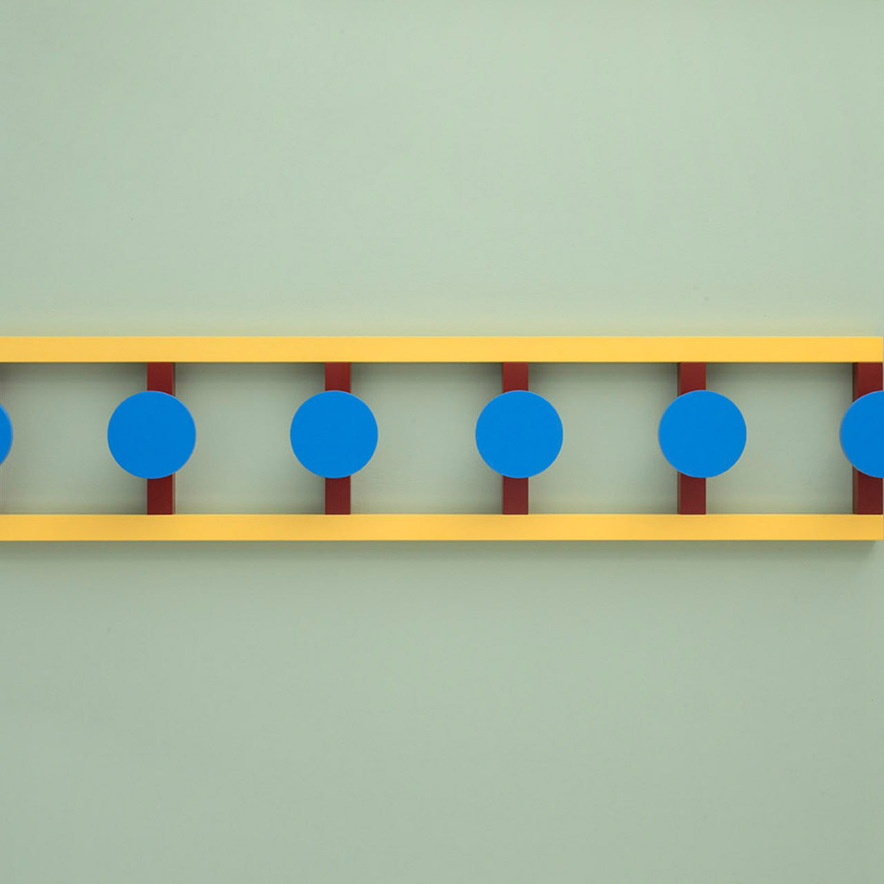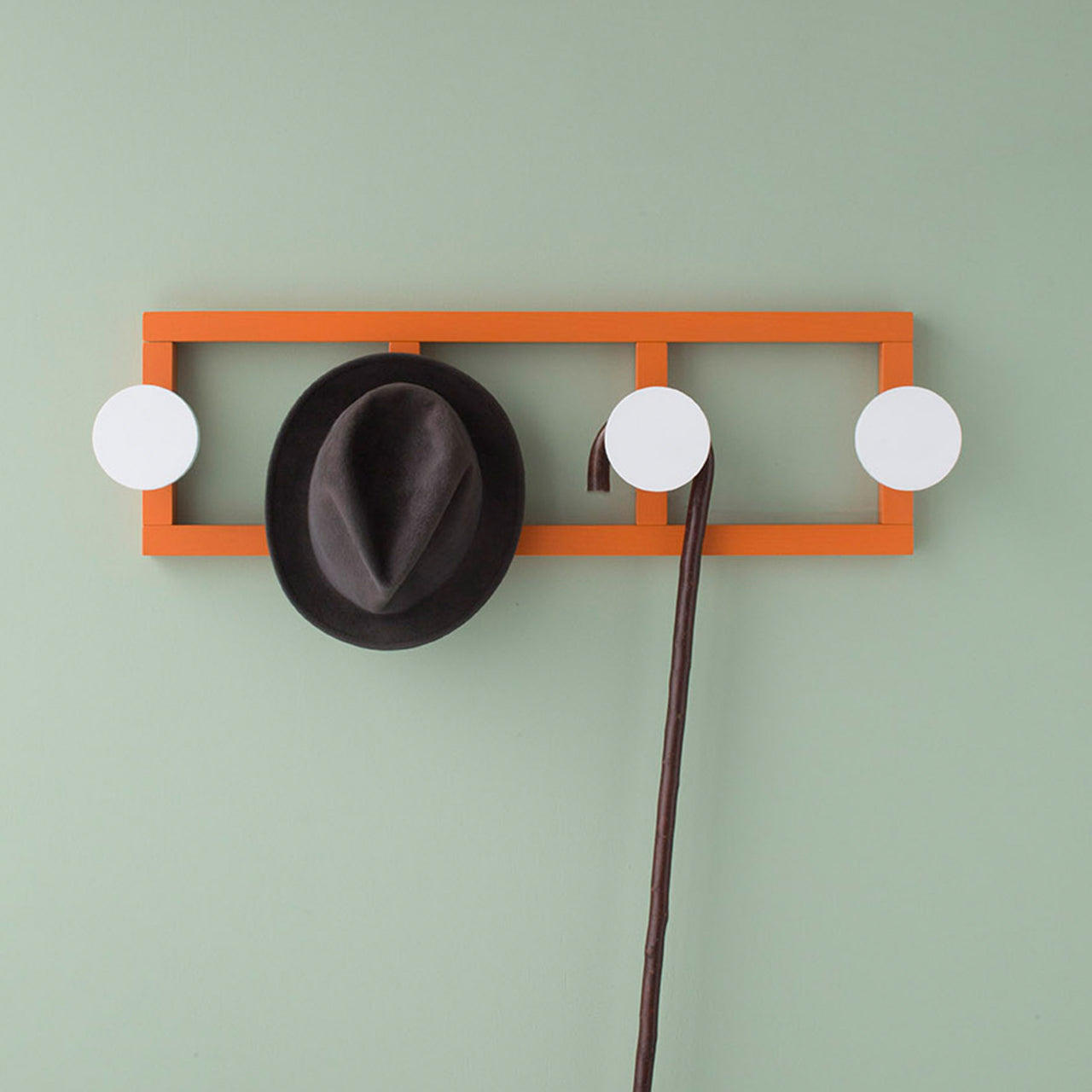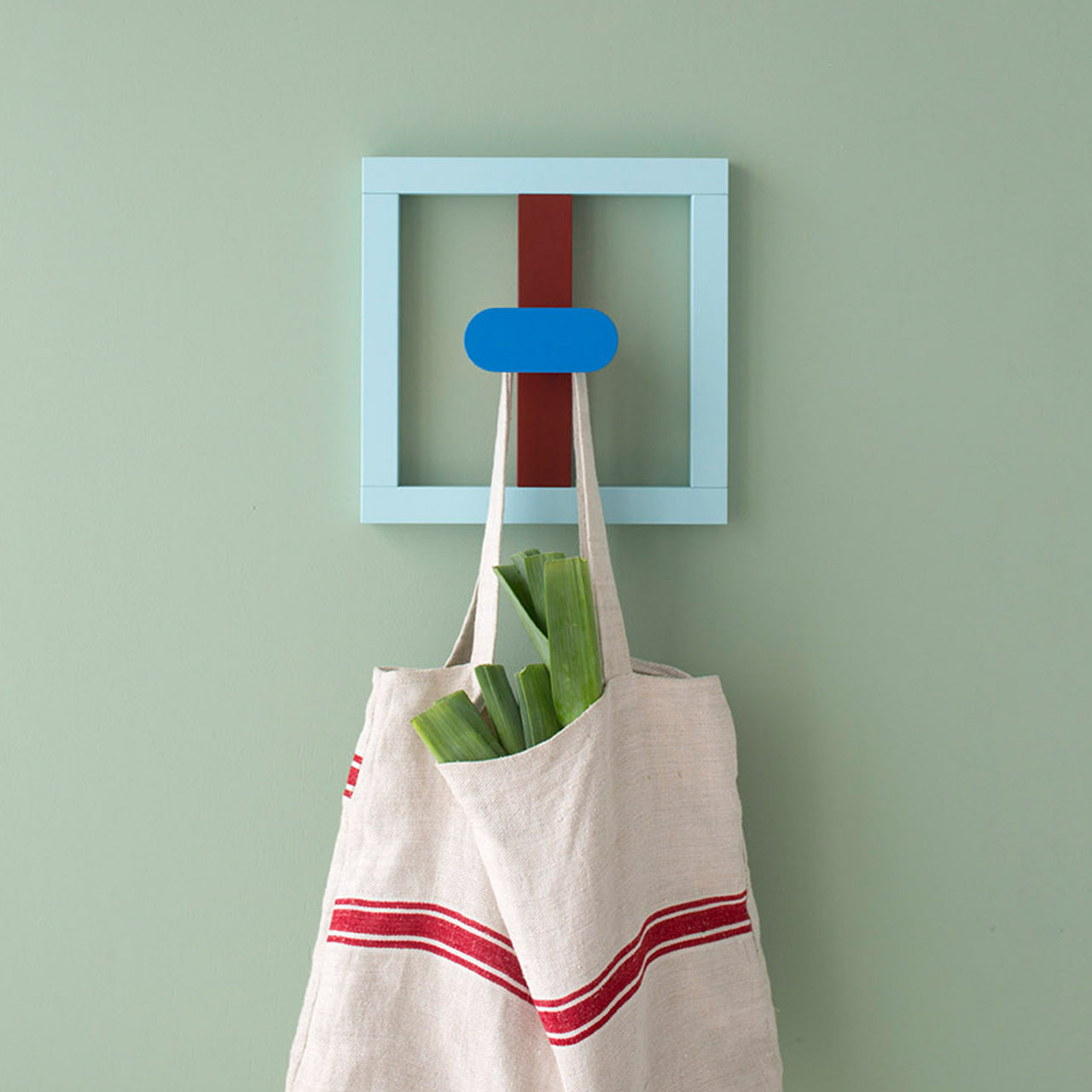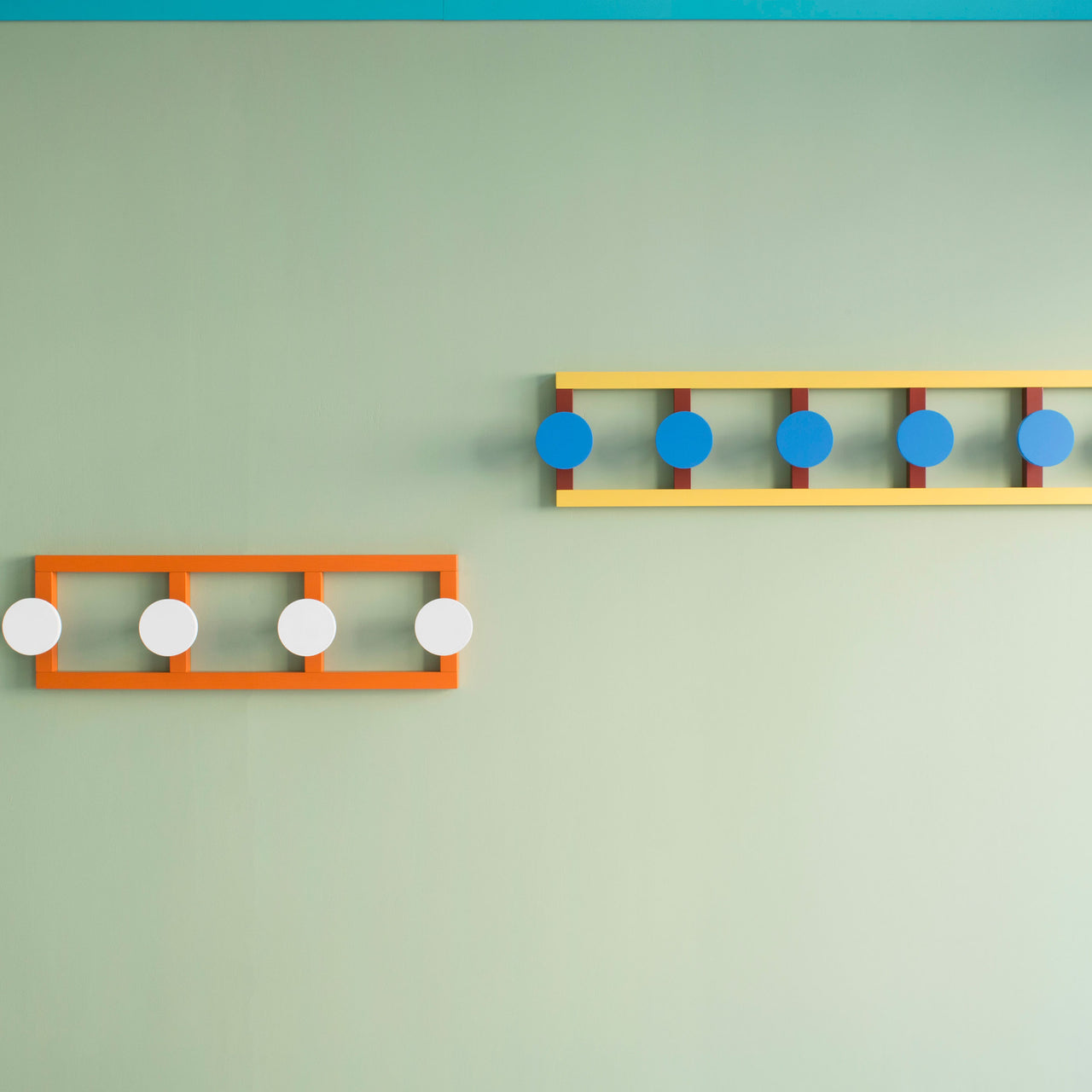 The Hook series introduces character and practicality to the wall, with wooden pegs handmade through traditional woodworking and finished in bold color combinations that give each piece personality.