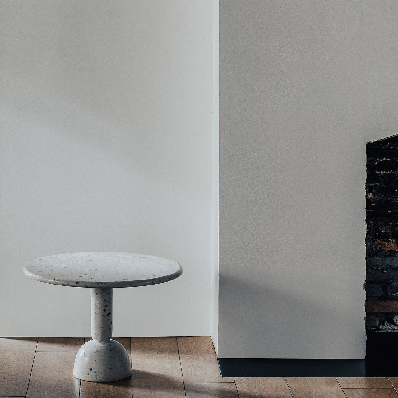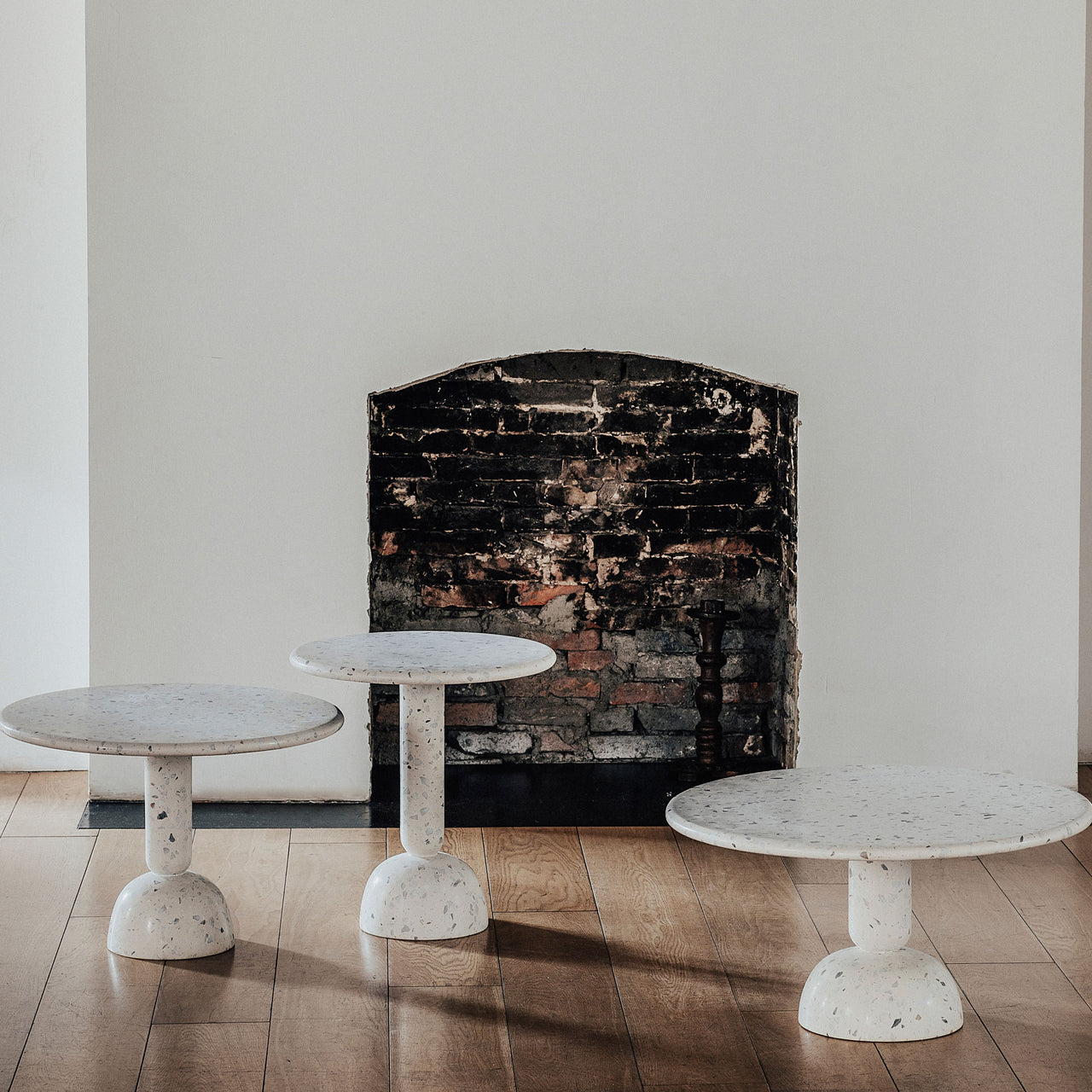 The Taiko Coffee Table features a rounded terrazzo top supported by a slender cylindrical stem and a gently domed base, drawing on the form of traditional Japanese drums. Made from terrazzo in ice rice white and in 3 sizes, each top displays naturally varied flecking. Solid in construction and visually grounded, the table works well on its own or grouped, offering a compact, durable surface suited to a variety of settings.