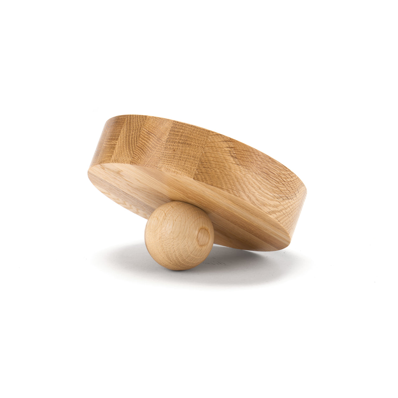 The Circle Sphere Clock is made from Abet Laminati laminate with a choice of a brushed aluminum backing that adds subtle contrast. A wood or polished aluminum sphere serves as both handle and base, allowing the clock to rest upright on flat surfaces.