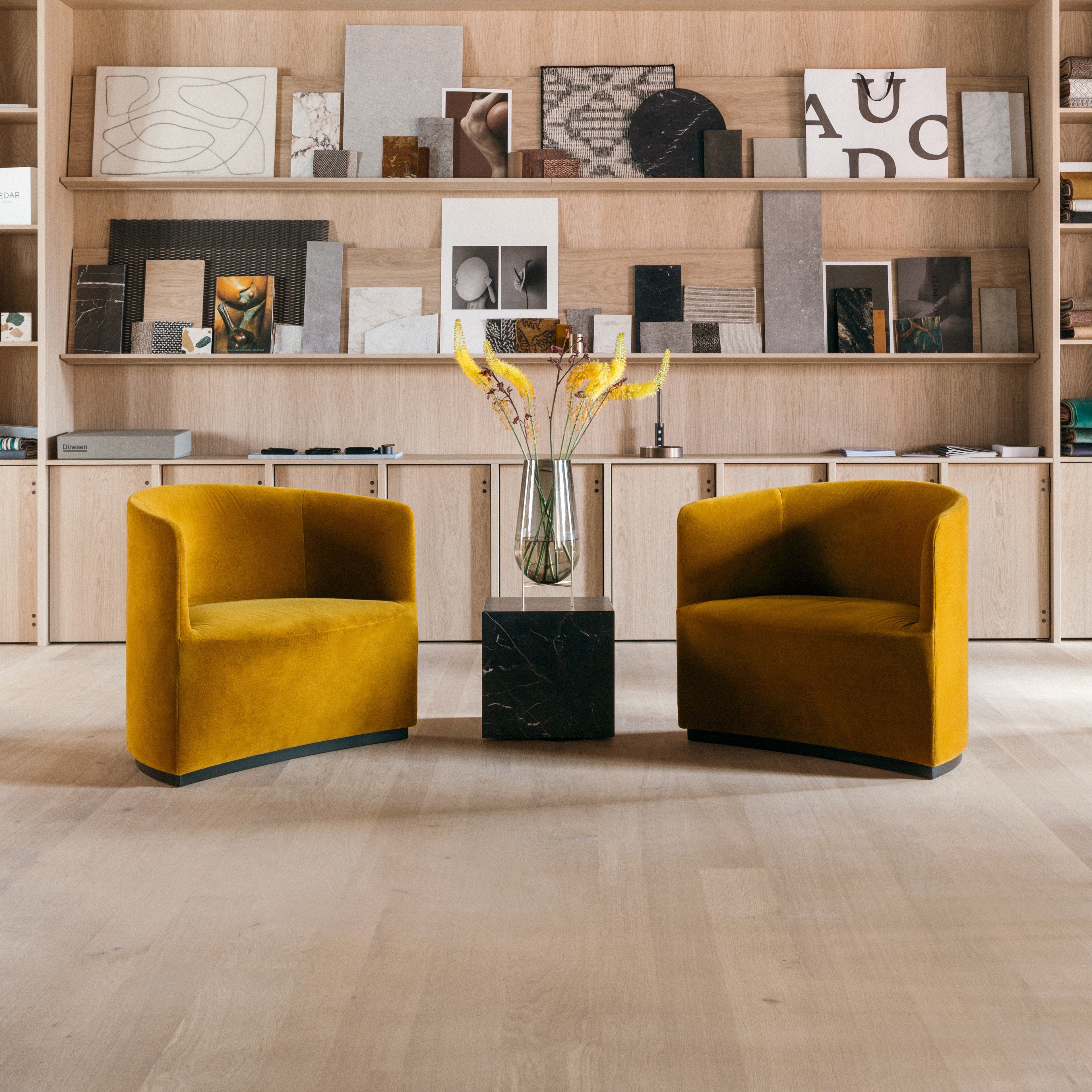 Nick Ross says his lounge chair sits “in the middle between a purely sculptural expression and a functional, utilitarian object.” Tearoom wraps its comfort-inducing interior wood and foam construction in a sleekly upholstered wraparound curve. The Stockholm-based designer alludes to the chair’s appeal by adding, “The balance makes it universal in form and function, and gives it staying power.”