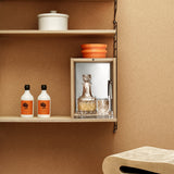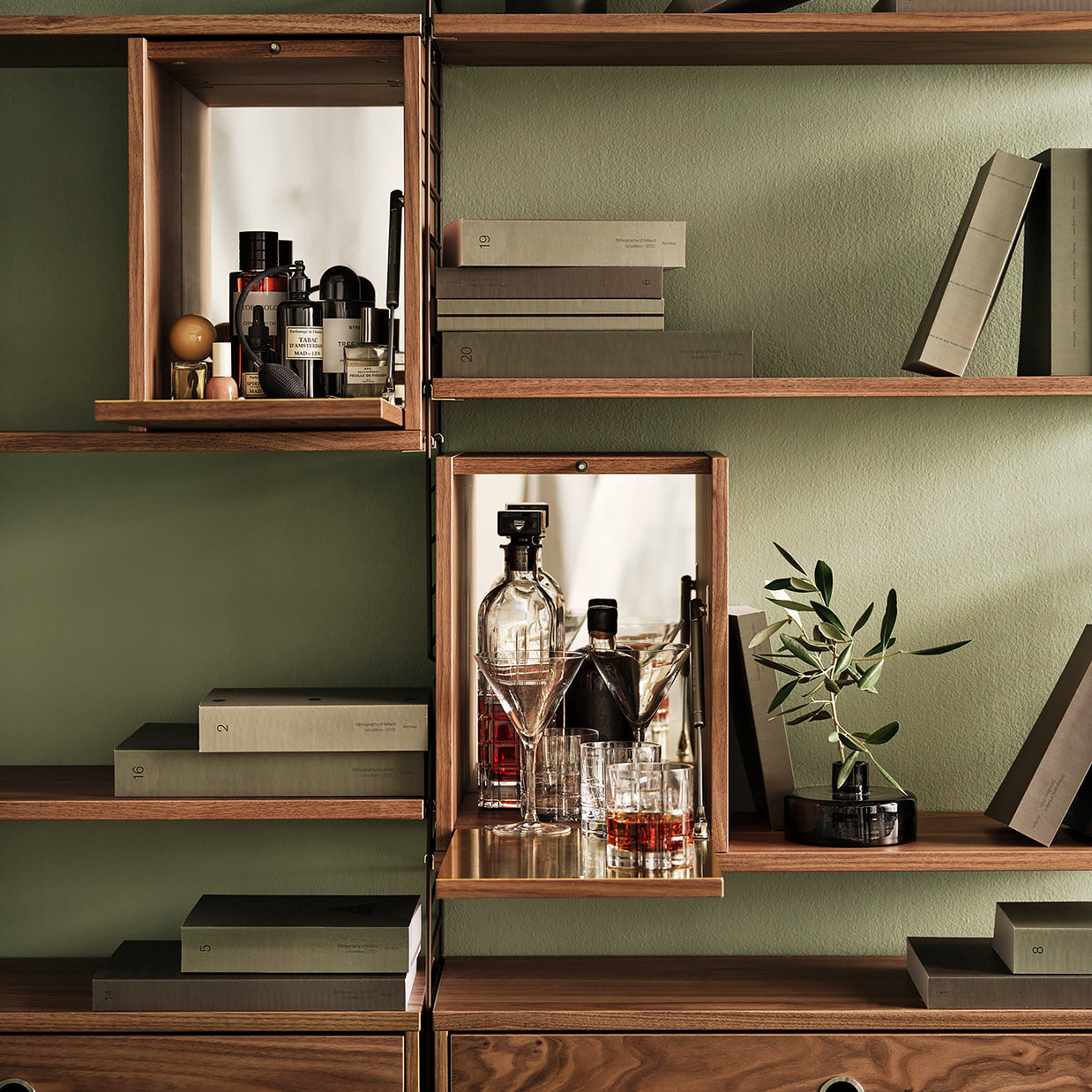 Tiny is an elegant little holdall with a drop-down door, sized to fit with all 30 cm deep wire panels from String System. The unit needs to be placed on top of either a wooden shelf or one of the larger cabinets and attached to one of the side's wire panel. Made of lacquered walnut veneer, the inside of the cabinet's lid is surfaced in brushed stainless steel—handy for holding a drink if it's used as a bar compartment. And the back of the cabinet has a reflective mirror for easy retrieval of items.