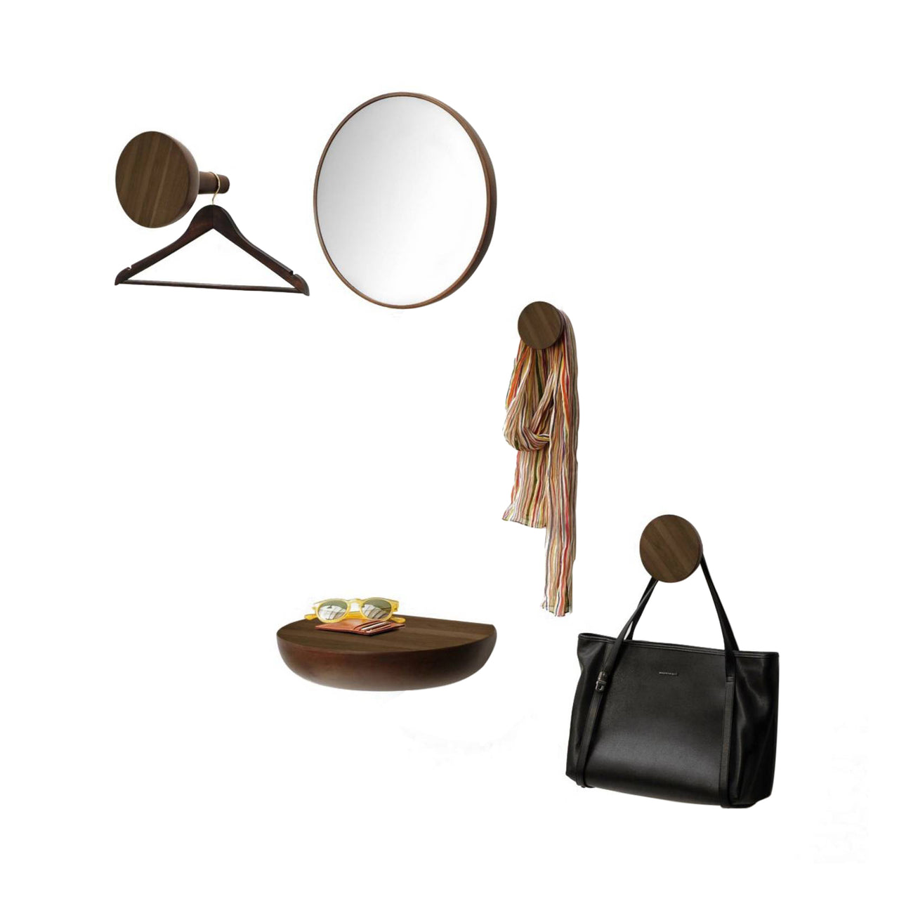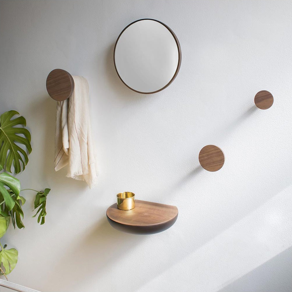 Usher guests into the home in individualized style with Nomon Home's suite of entryway furnishings. Beautifully handcrafted in solid wood with a walnut face, Welcome comprises wall pegs in a choice of 3 sizes, a curved shelf and a round wall mirror. Choose any or all of these eye-catching elements as a thoughtful expression of hospitality.