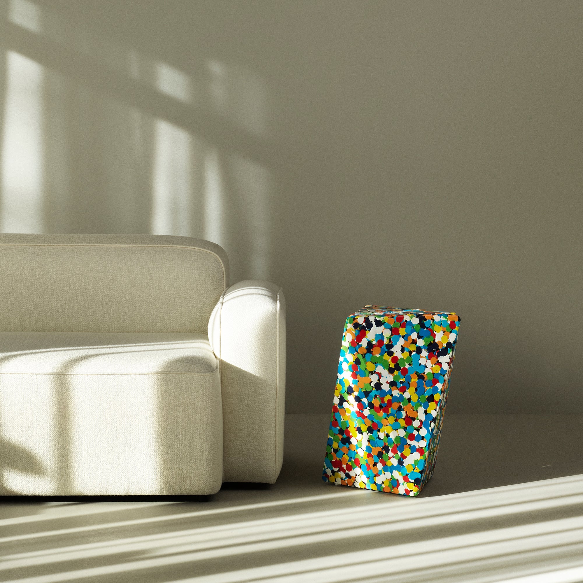 Crafted with sustainability in mind, the Delta Proust Side Table transforms recycled industrial polyethylene into a vibrant sculptural piece. Each table features a unique pixelated mosaic in bold hues and white tones, ensuring no two are alike. Suitable for both indoor and outdoor use, it’s as durable as it is expressive.