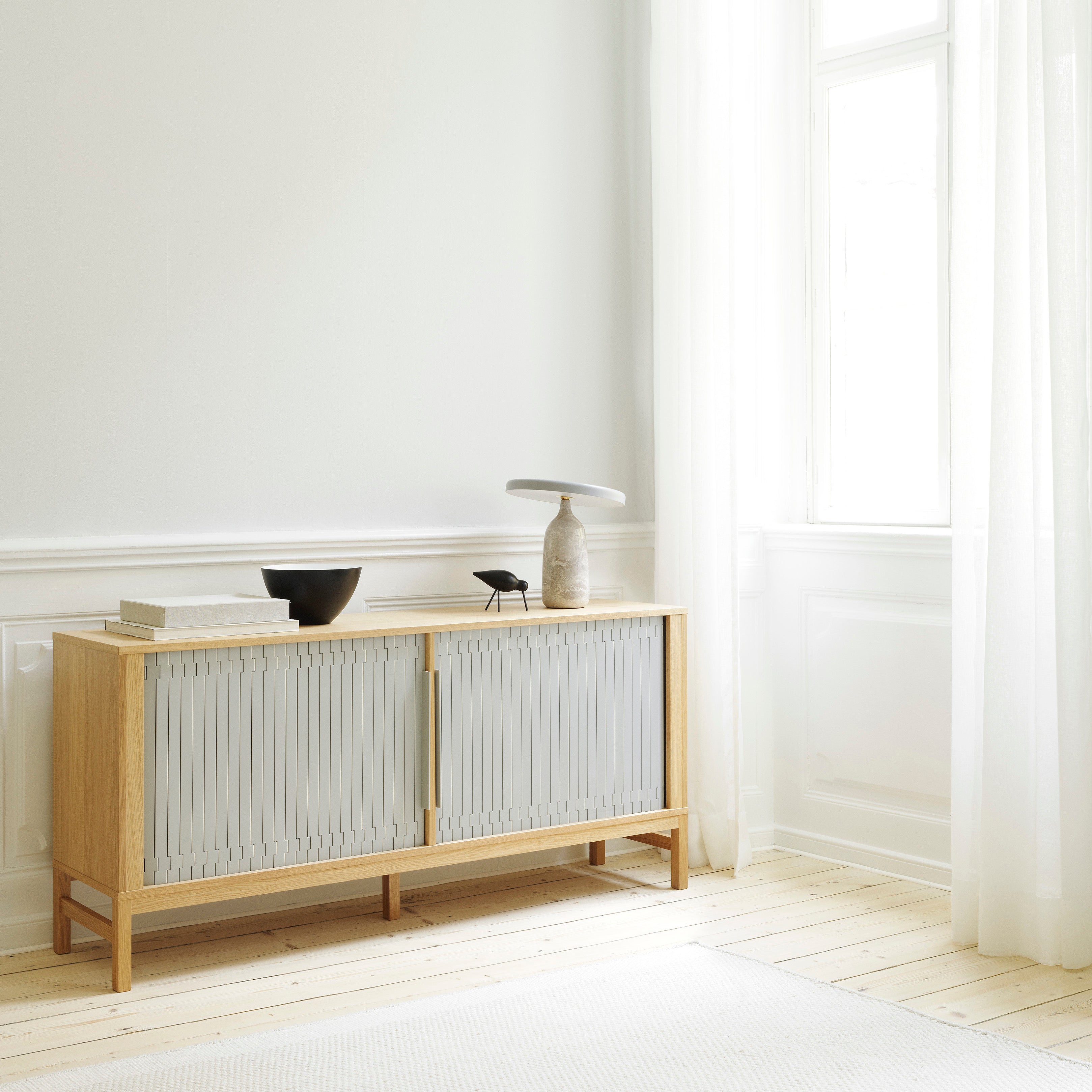 Designer Simon Legald cleverly adapts his updated roll-front cabinet as a generously proportioned sideboard. Jalousi takes the classically modern sliding closure and puts it in a new context as a contrasting graphic element to the oak veneer finish. The low cabinet is perfect to hold all the accoutrements for mealtime in the dining room or as refined storage all throughout the home.