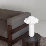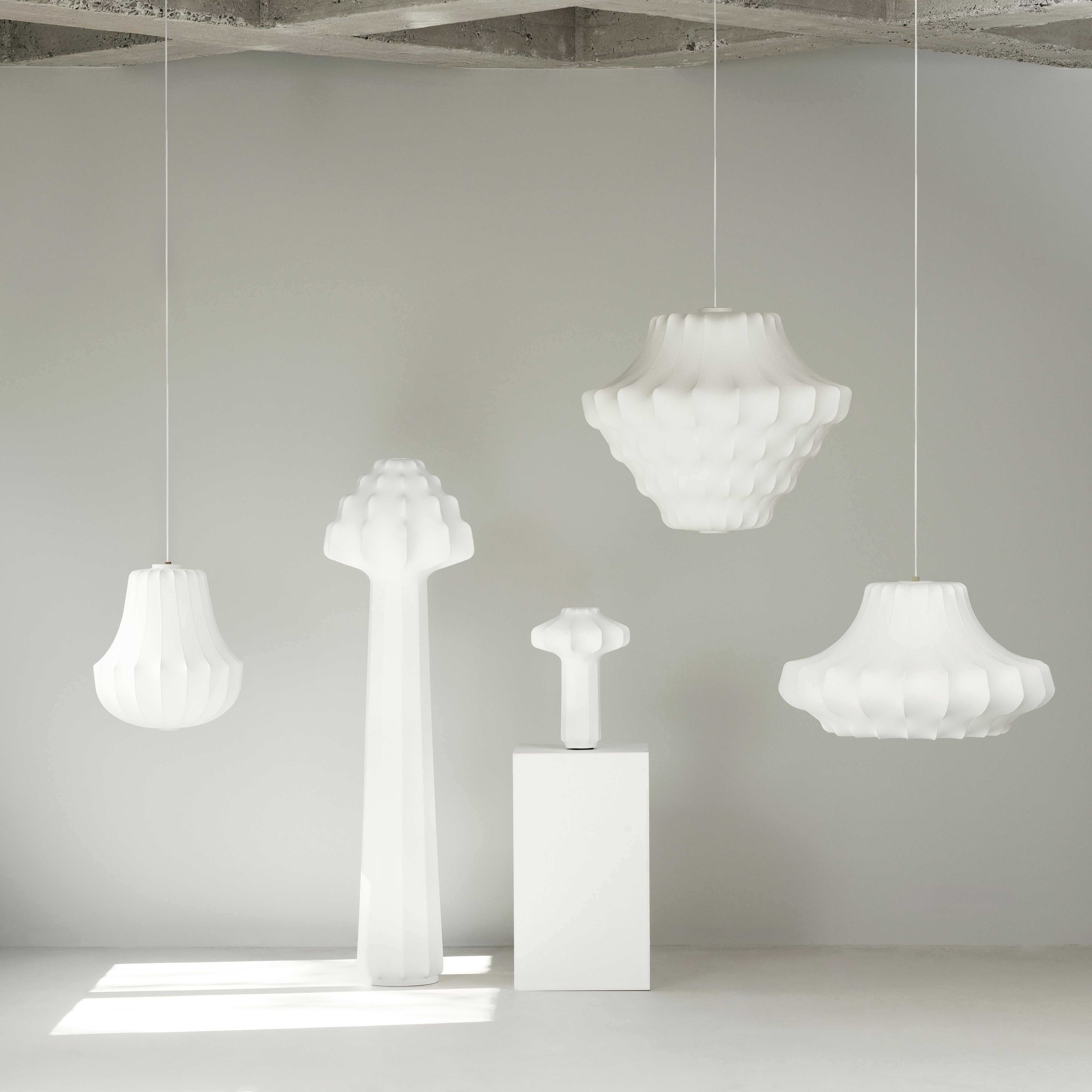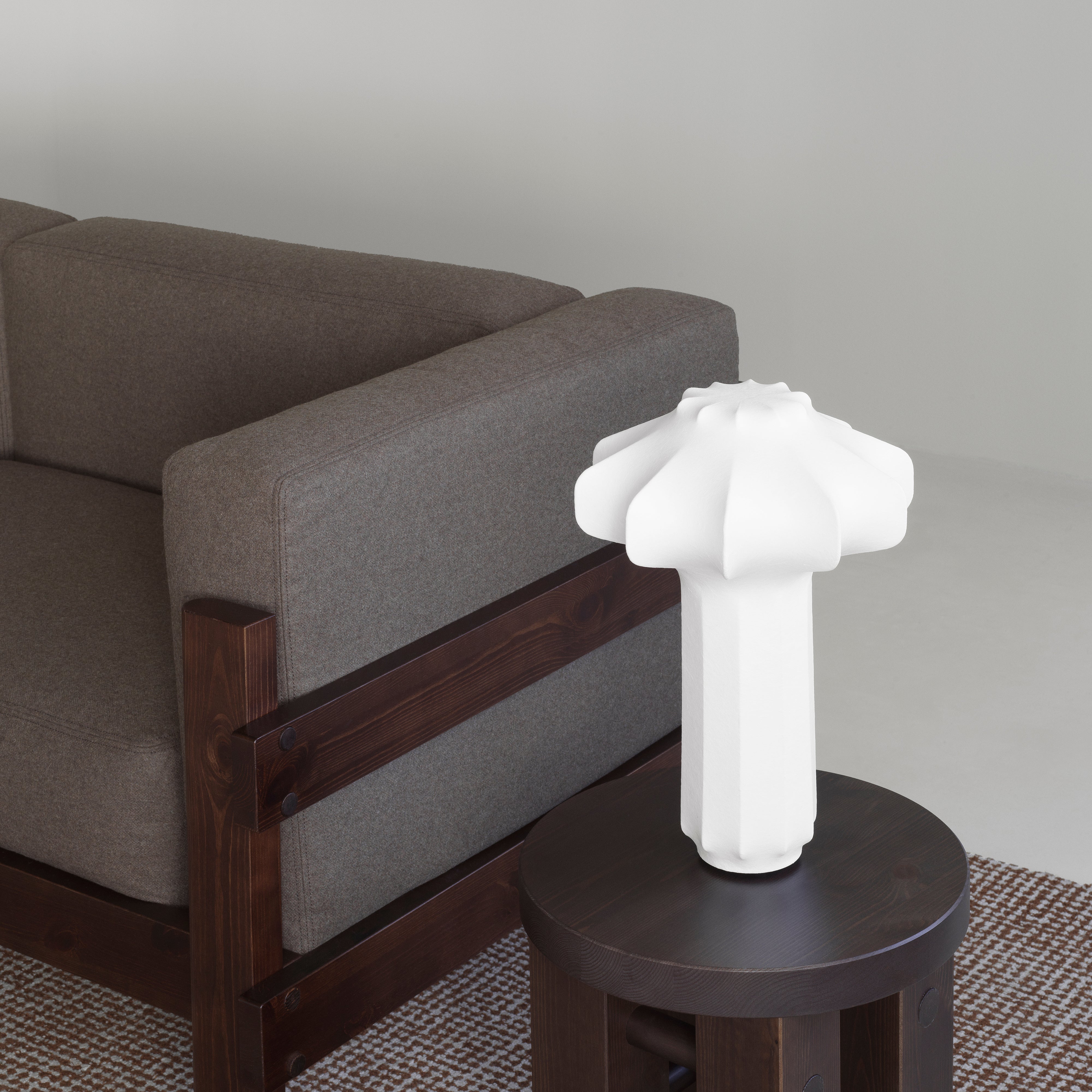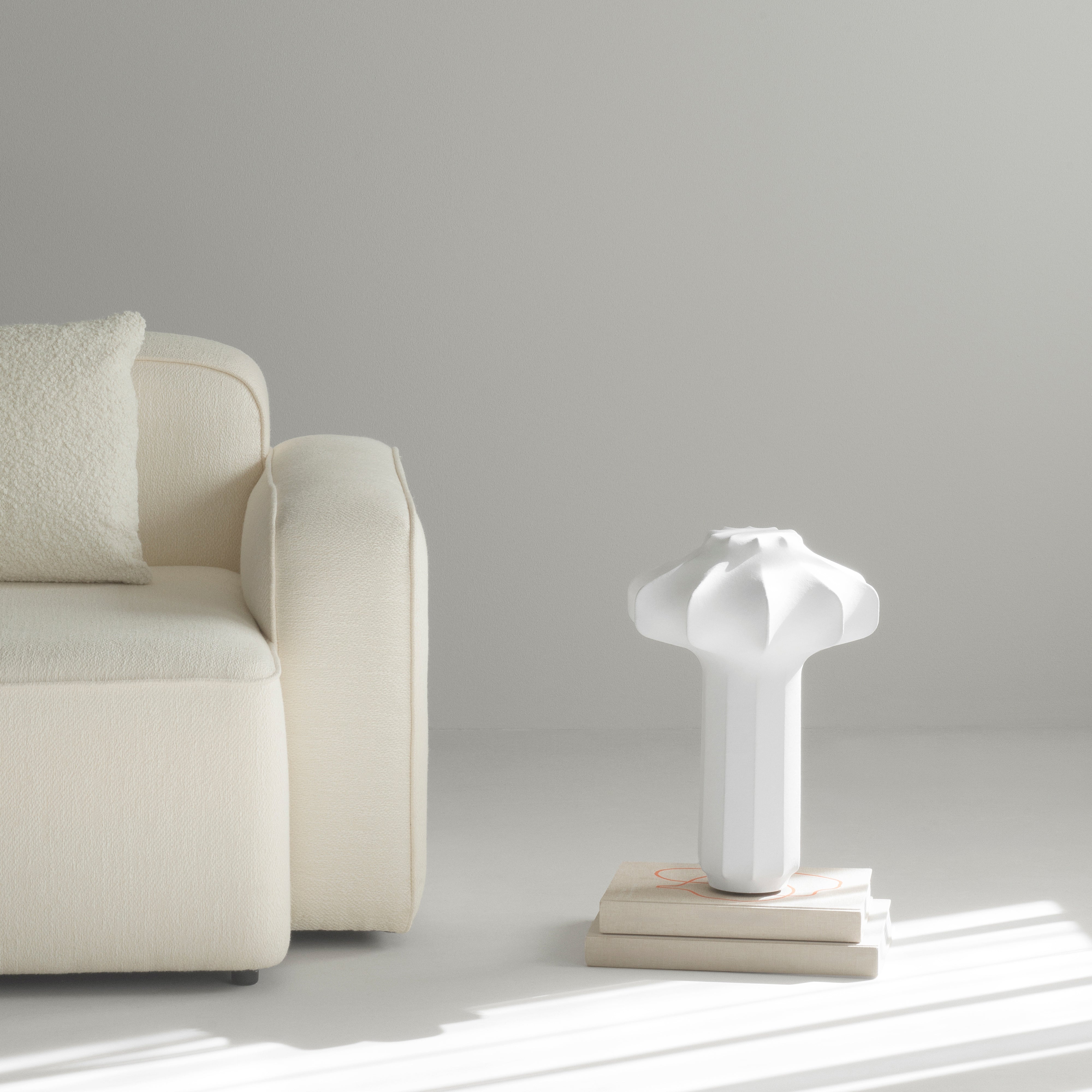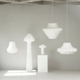 The Phantom Table Lamp casts a soft, ambient glow through its layered, cocoon-like silhouette—an homage to classic chandeliers reimagined in sculptural form. Semi-transparent resin is sprayed over a steel frame, diffusing light from the integrated dimmable LED. Compact and versatile, it fits seamlessly on a bedside table, shelf, or sideboard, with easy brightness control via a built-in dimmer.