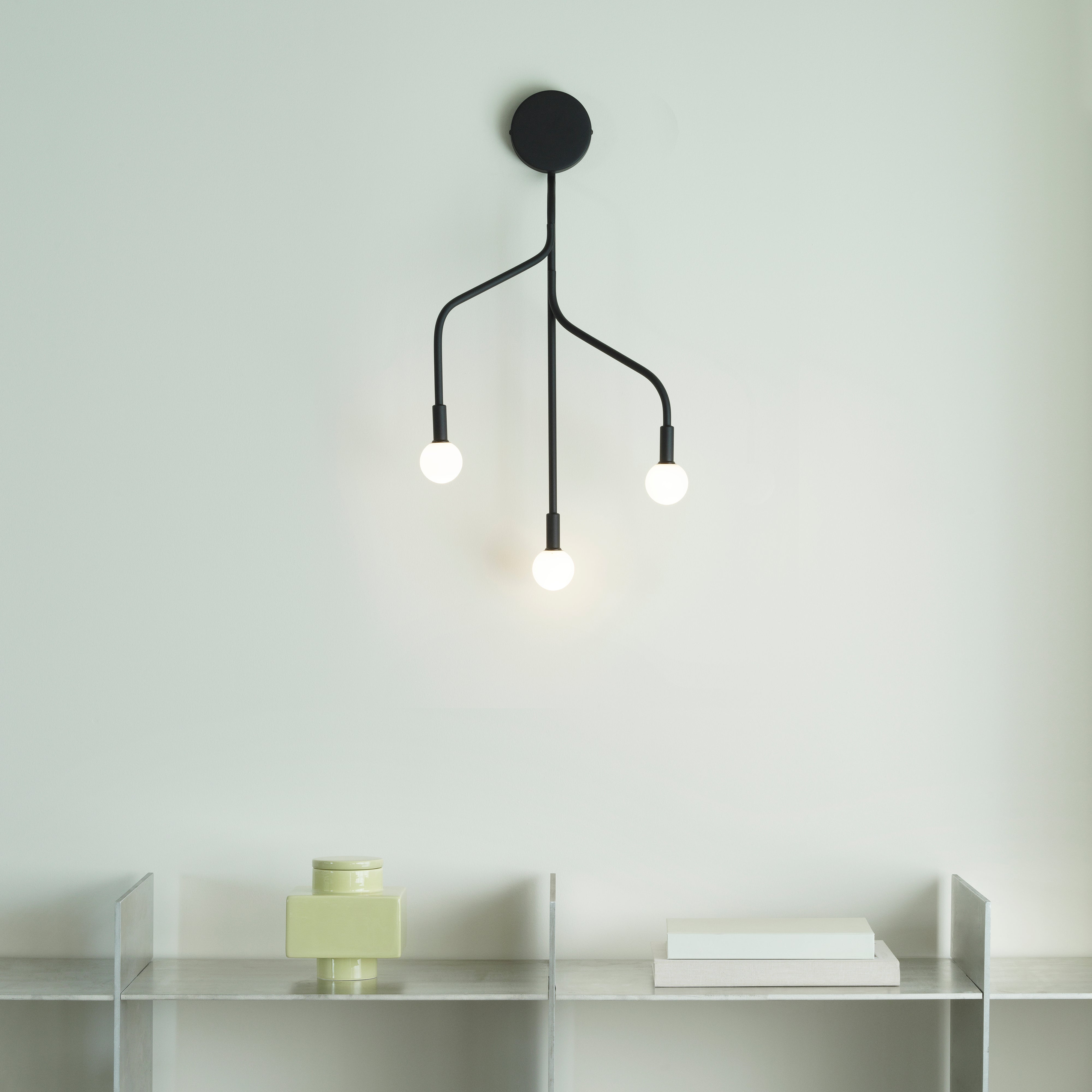 The Vekst Wall Lamp is a sculptural design inspired by nature. Its slender, branch-like arms are crafted from powder-coated steel, each holding a bulb surrounded by a sphere of etched opal glass. This organic, tree-like lamp offers a soft, ambient light. The Vekst collection includes both pendant and wall lamp versions, all featuring dimmable LED bulbs.
