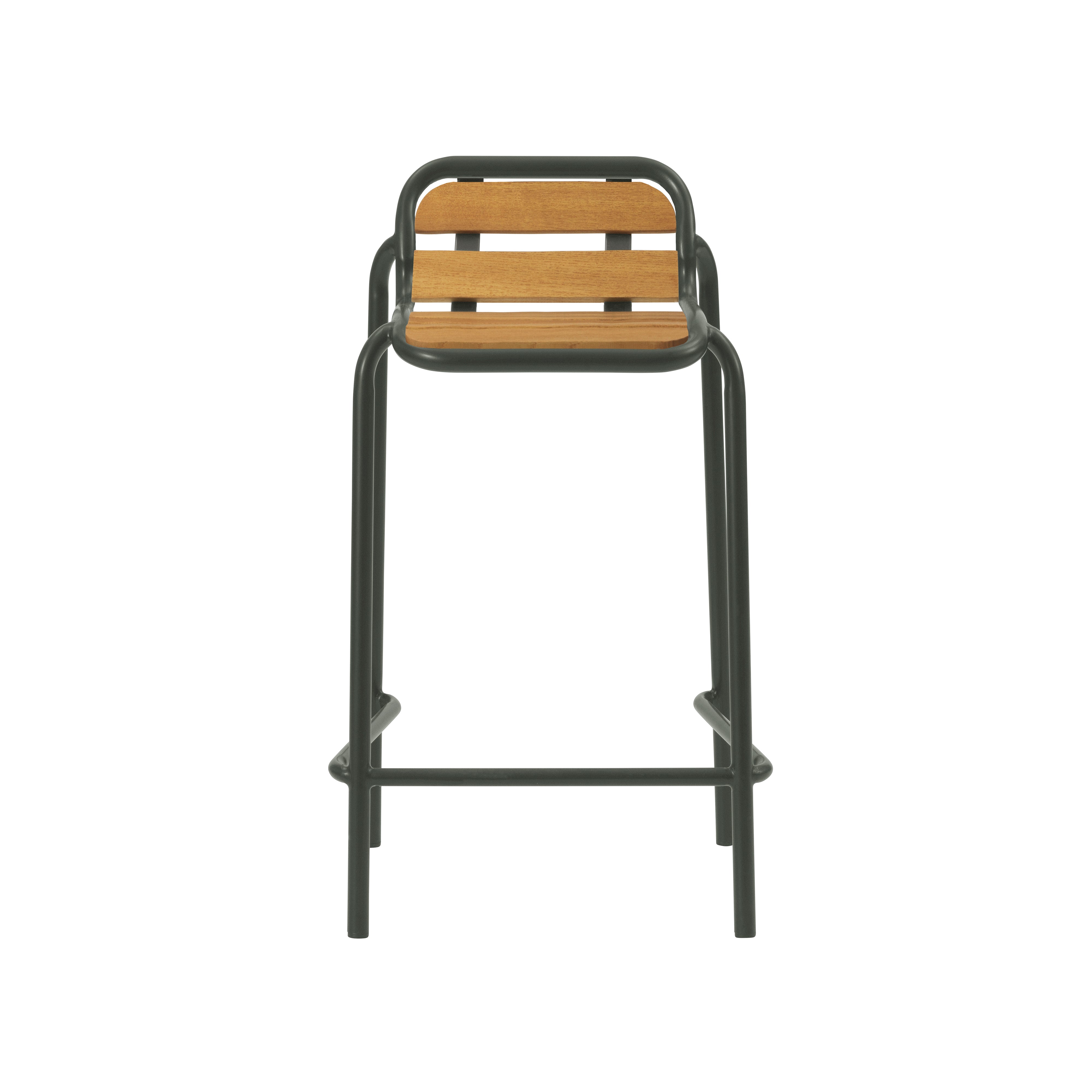 The Vig Stacking Bar + Counter Stool is crafted from durable double powder-coated steel, making it ideal for extended outdoor use while maintaining its sleek appearance. Its stackable design makes it highly functional for flexible seating arrangements. The stool comes with a simple seat made from oiled robinia, free of excessive decoration, highlighting the refined take on outdoor dining. Available in colors black, grey, and dark green, the Vig collection offers a cohesive collection of outdoor furniture.