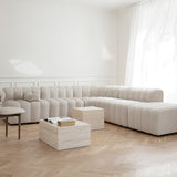 The Cubism Coffee Table is made from travertine stone and has a minimalist geometric form that highlights the unique textures and imperfections of the stone. Available in two sizes, the Cubism Coffee Table can be used as a coffee table, side table, or even as a plinth to showcase objects. Its polished, untreated surface is complemented by a felt bottom, which protects floors from scratches. Due to the nature of travertine, each piece is unique, with variations in color and vein patterns.