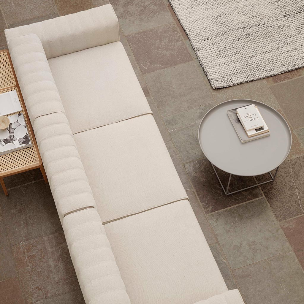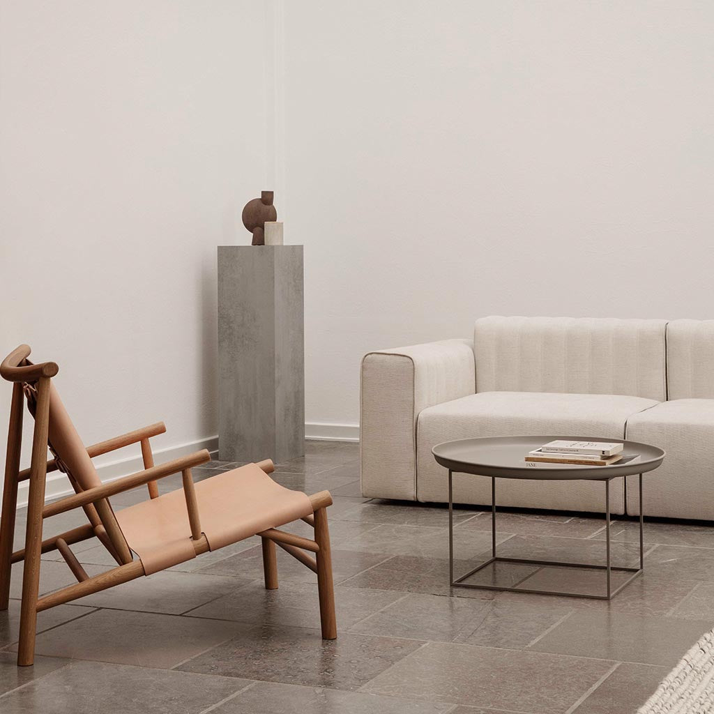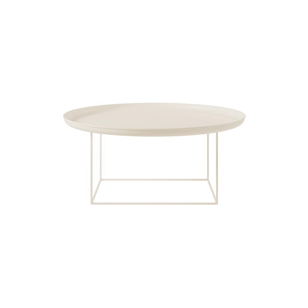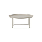 The Duke Coffee Table is a multifunctional and minimalist piece, designed with a removable, spun metal tray that sits on top of a powder-coated steel frame. The table's frame can be rotated to adjust the height, allowing for flexibility in different interior settings. Available in a range of lacquered colors or natural finishes.
