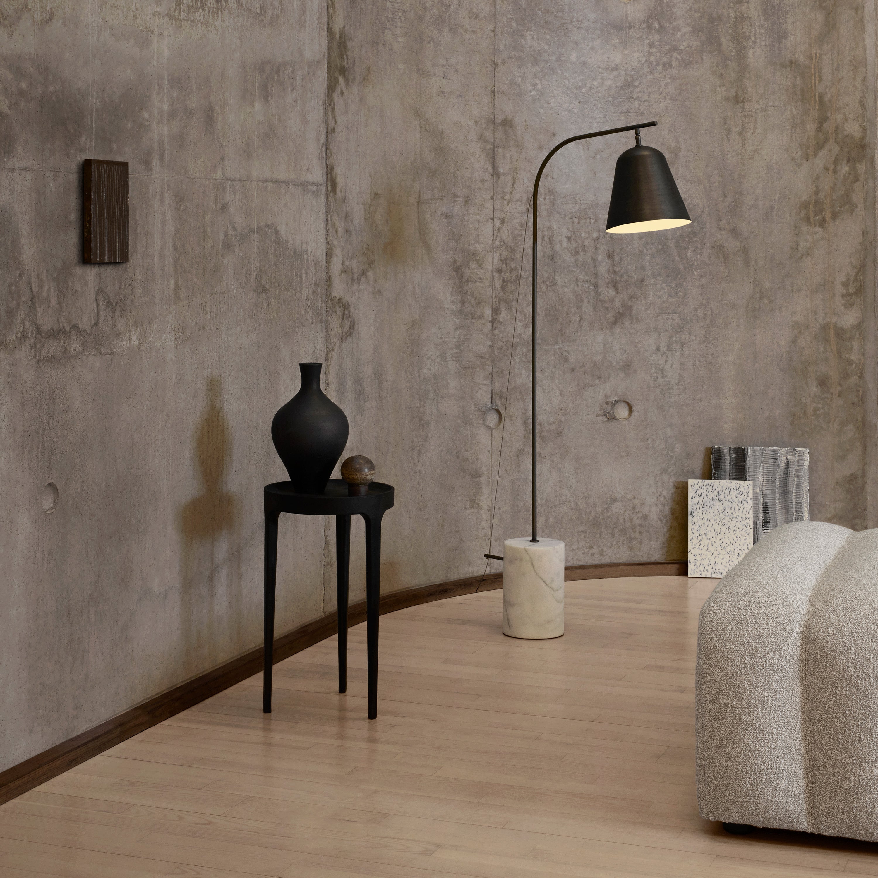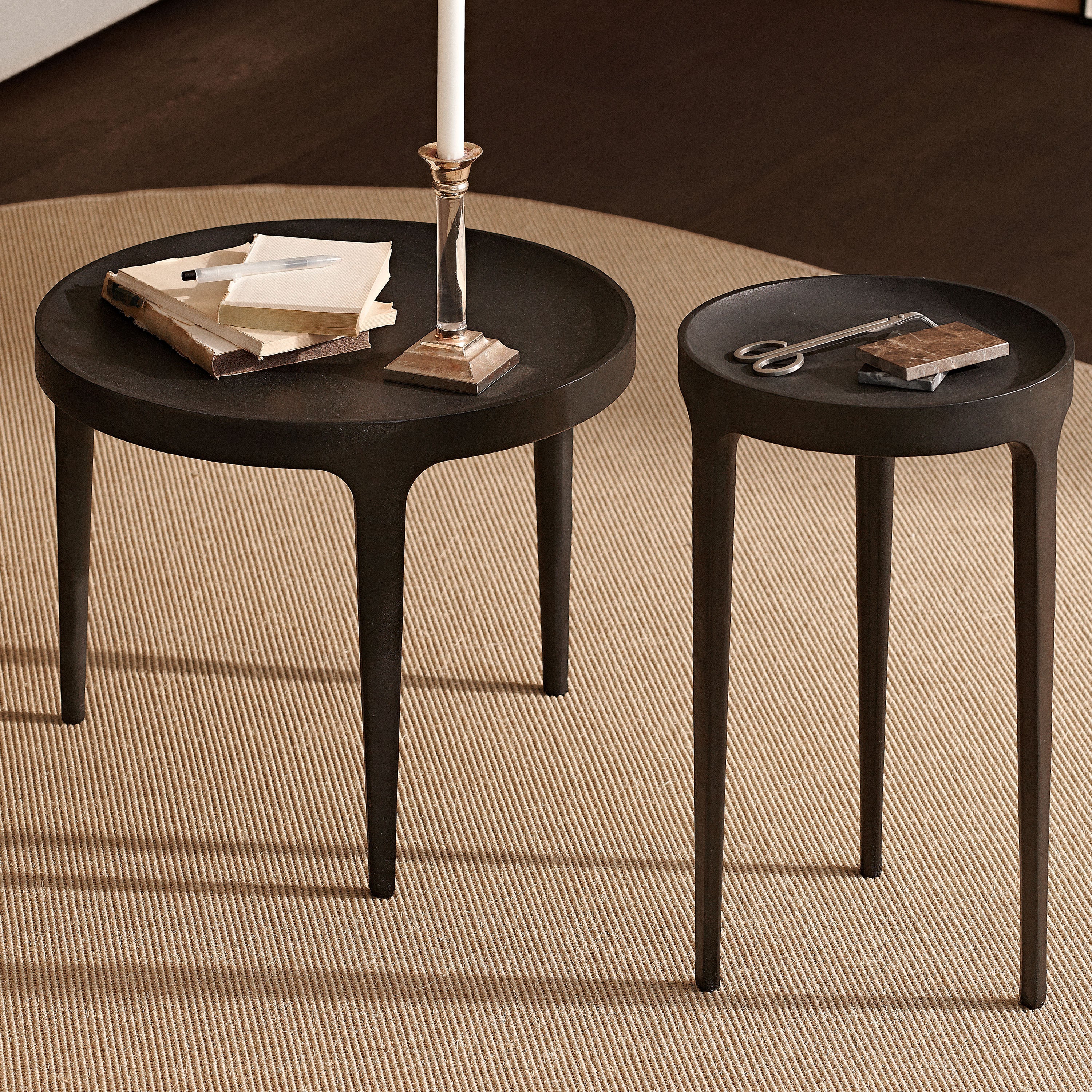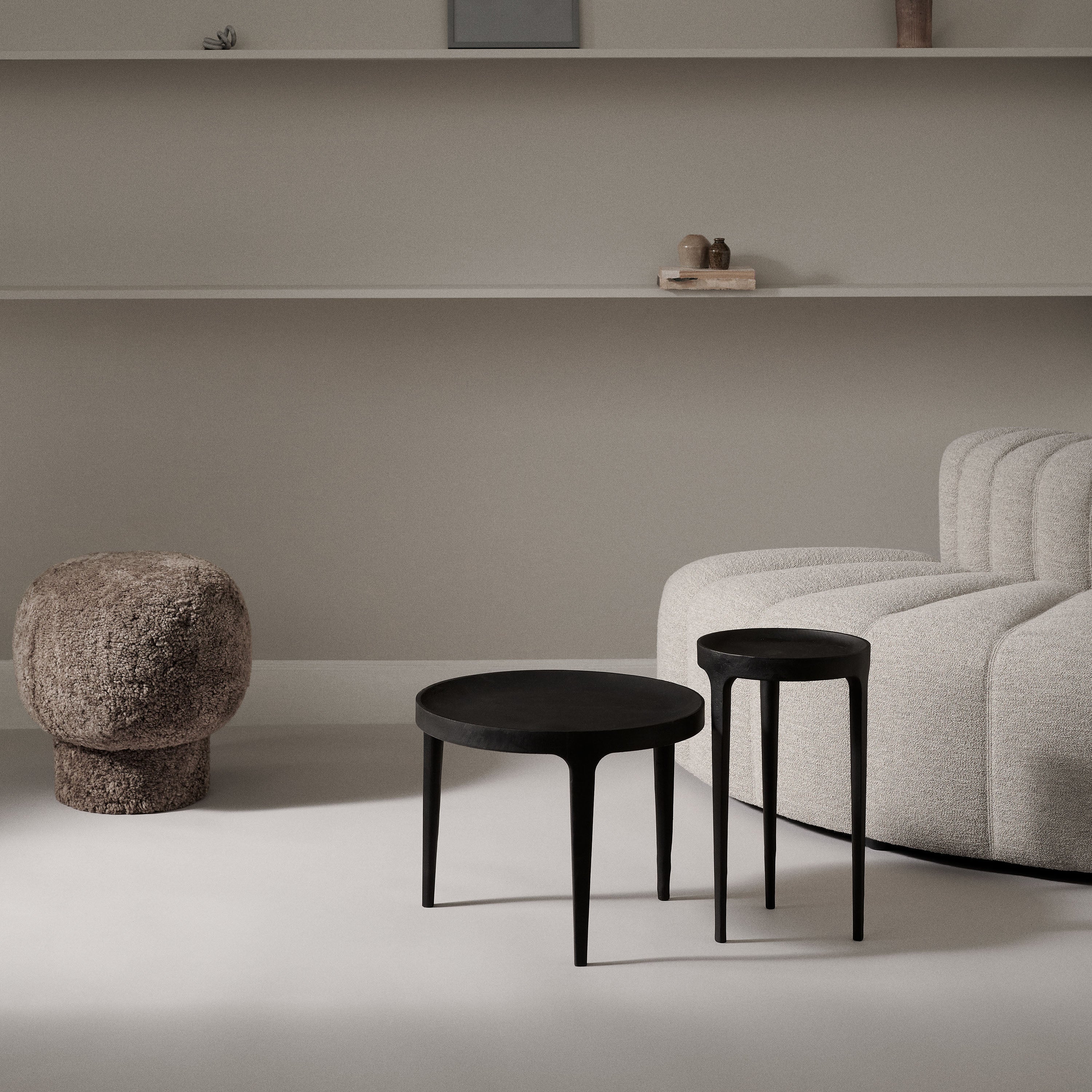 The Ghost Side Table stands out with its raw, industrial aesthetic. Cast from aluminum, the table retains the rugged, tactile feel of its mold, resulting in an unpolished, almost primal texture that makes each piece truly unique. Its three-legged structure is both sturdy and elegantly minimalist, with a distinct groove running along the tabletop edge, adding subtle detail. Finished in a deep black powder coating.