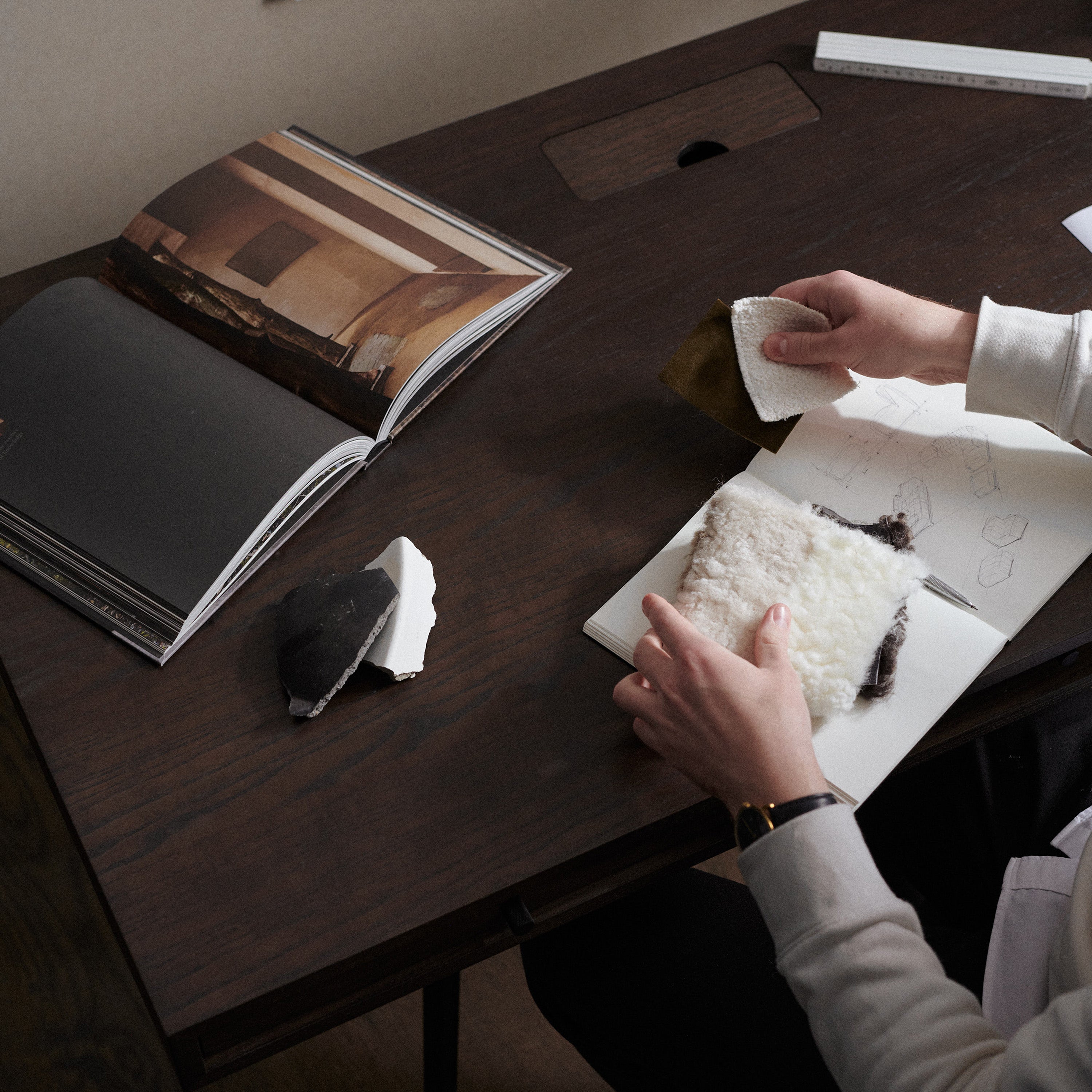 The JFK Home Desk is a refined nod to the classic office desks of the 1960s. Designed by Kristian Sofus Hansen and Tommy Hyldahl, it features a sleek veneer tabletop with three inbuilt drawers, perfect for storing laptops and office supplies. The small, knurled knobs on the drawers are a tribute to the aesthetic of old radio buttons from the '50s and '60s. This desk is crafted from ash veneer and supported by matte black powder-coated aluminum legs. The height-adjustable variation ensures ergonomic comfort for various user heights. It also includes a hidden compartment for cable management.